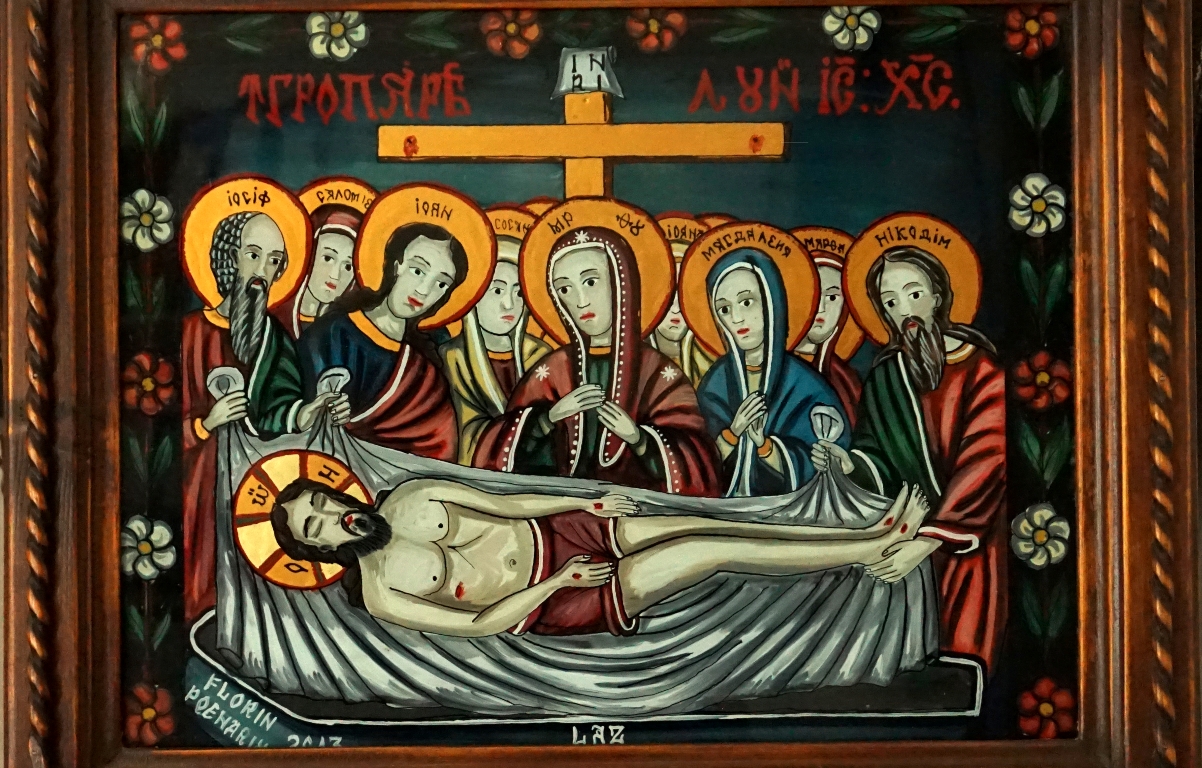 Lucrarea, executată în tehnica ulei pe glajă și având dimensiunile de 55 x 45 cm, ilustrează una dintre cele mai emoționante scene ale iconografiei creștine – momentul îngropării Mântuitorului.