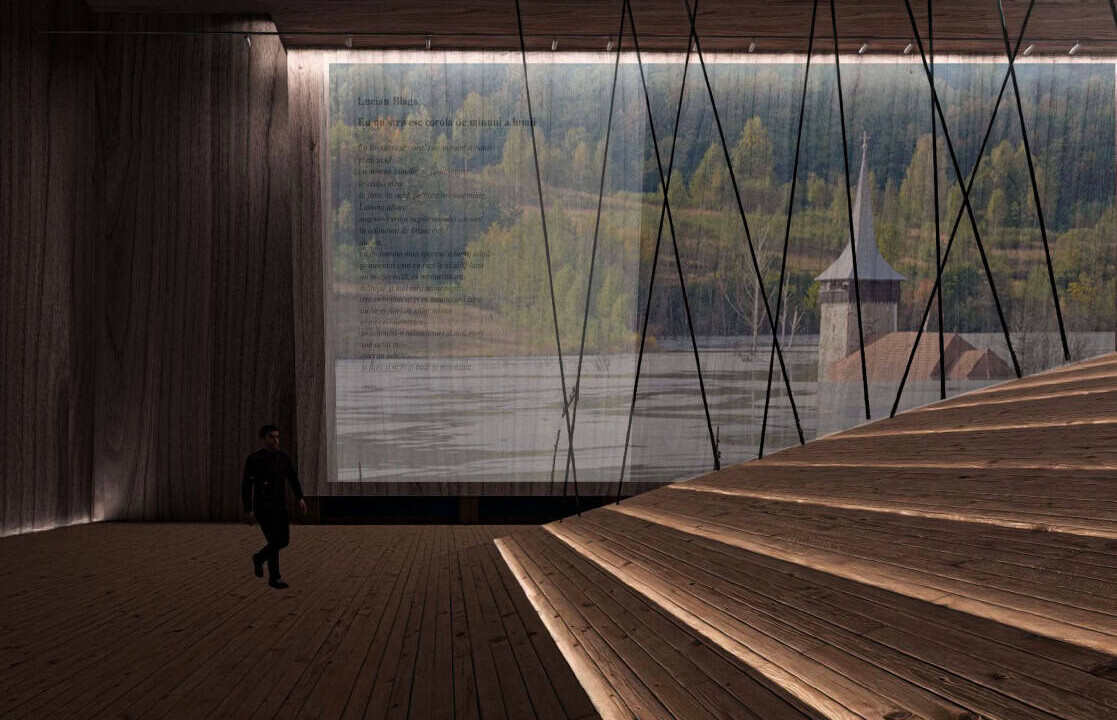 Imaginea bisericii scufundate din Geamăna și cea a carierei de la Roșia Montană, integrate în pavilionul României de la Osaka