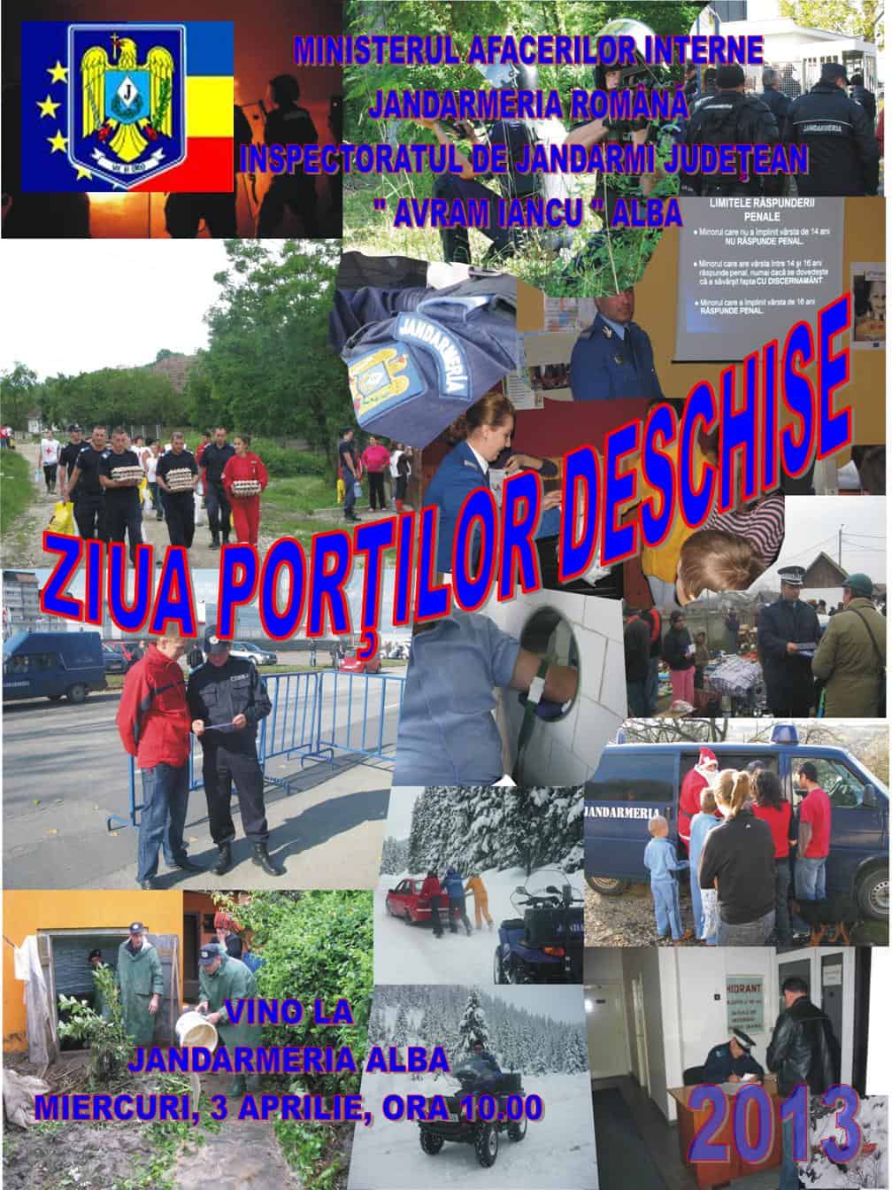 Miercuri, 3 aprilie, între orele 10.00 şi 14.00, porţile Inspectoratului de Jandarmi Judeţean Alba vor fi larg deschise pentru toţi cei care vor dori să cunoască mai multe detalii despre această instituţie. Vor fi expuse echipamentele specifice de protecţie şi intervenţie, armamentul şi tehnica din dotare şi vor fi prezentate diferite exerciţii demonstrative (dispozitive pentru executarea controlului persoanelor, tehnici corporale, tehnici de control corporal preventiv a persoanelor şi bagajelor, tehnica folosirii mijloacelor din dotare, tehnici de înaintare şi pătrundere etc.).
