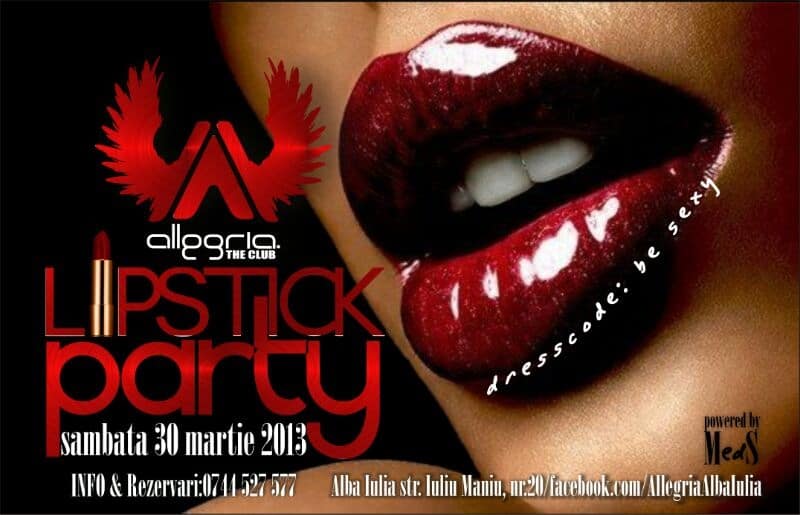 Club Allegria te invită, sâmbătă, la o petrecere specială, „Lipstick Party”. Doamnele și domnișoarele care vor purta culoare pe buze vor primi cadou câte un ruj pe care să îl folosească după bunul plac. Și băieții vor avea de câștigat. Cine strânge cele mai multe săruturi va câștiga un cocktail din partea casei.