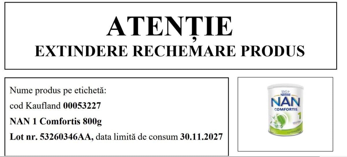Produsul vizat - NAN 1 Comfortis 800 g, Lot nr. 53260346AA, data limită de consum 30.11.2027 - este retras de la vânzare din magazine Lidl și Kaufland din Alba și din țară.