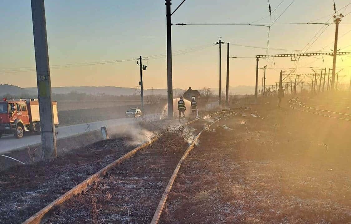 UPDATE, ora 18.00: Potrivit ISU Alba, incendiul se manifestă la vegetația uscată pe aproximativ 30 metri liniari, în proximitatea unor vagoane încărcate cu motorină.