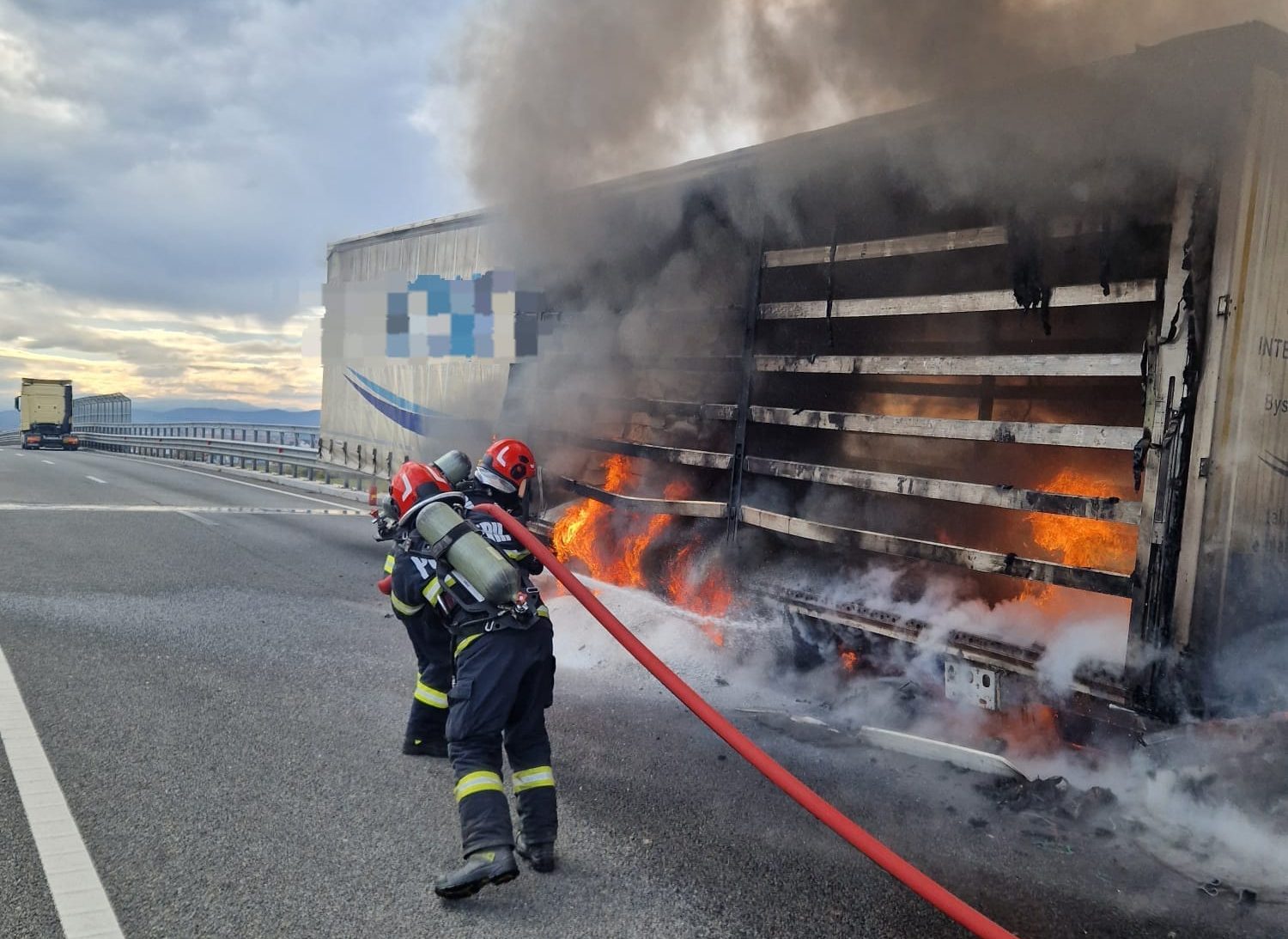 Incendiu pe Autostrada A1, în zona nodului rutier Sebeș. Din primele informații, focul a cuprins un autotren care transporta cauciucuri.