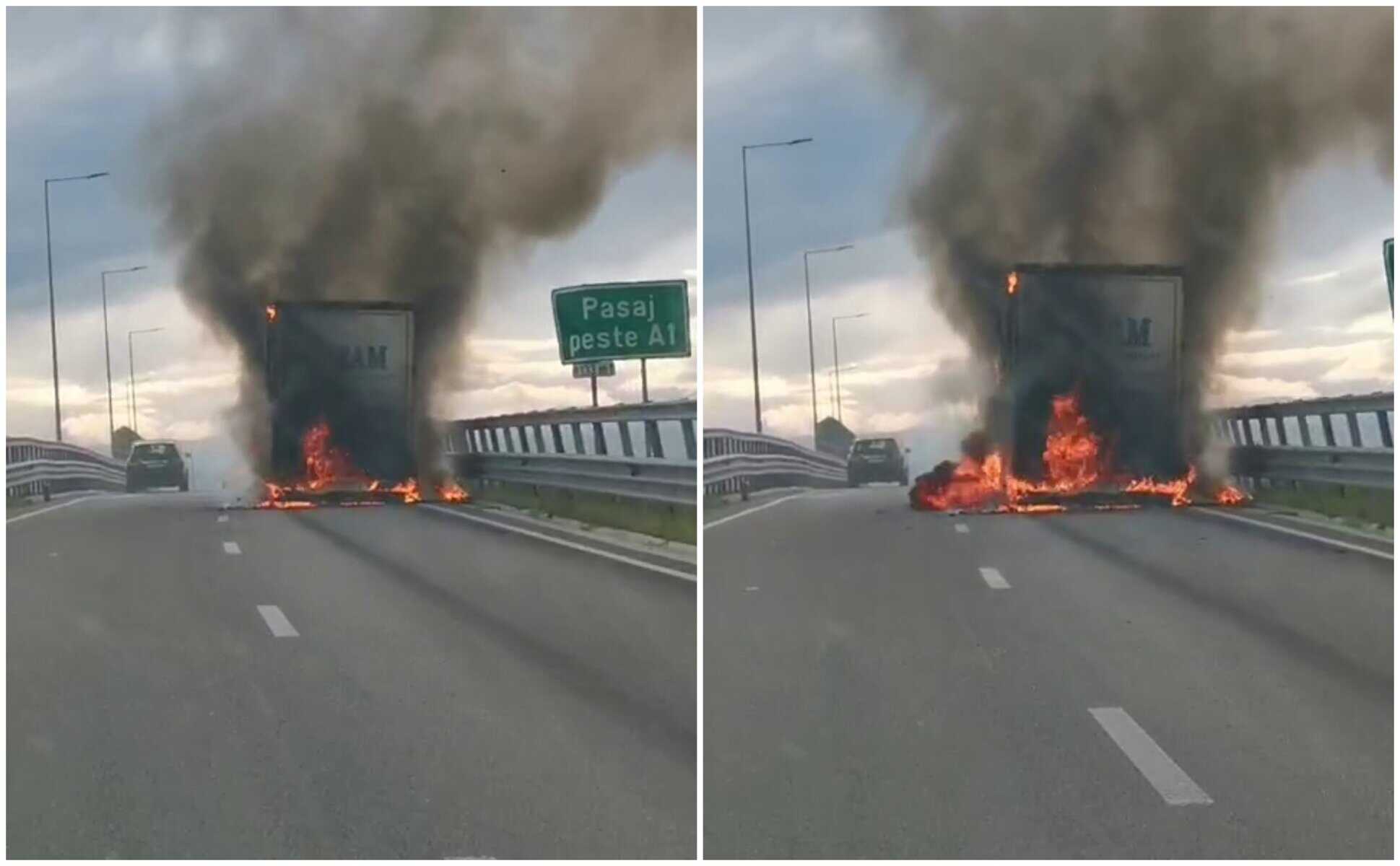VIDEO: Incendiu pe Autostrada A1, în zona nodului rutier Sebeș. Focul a cuprins un TIR care transporta cauciucuri