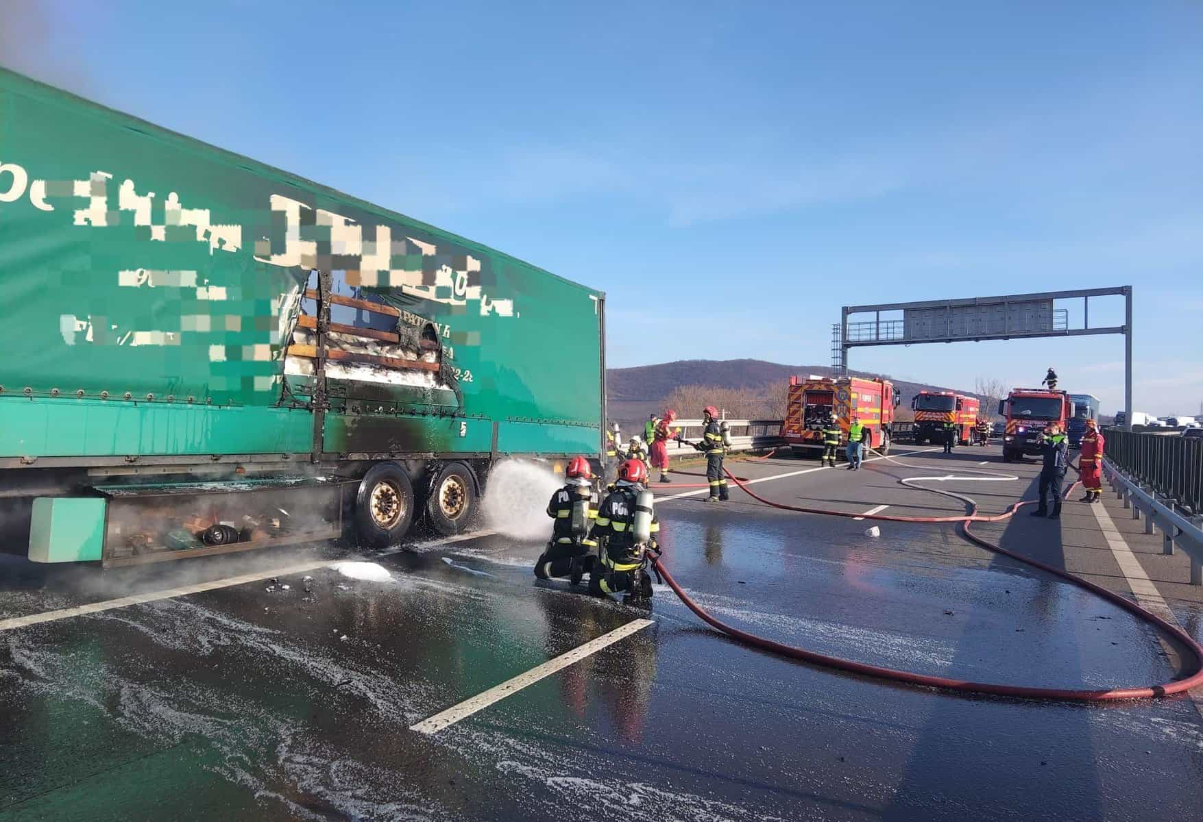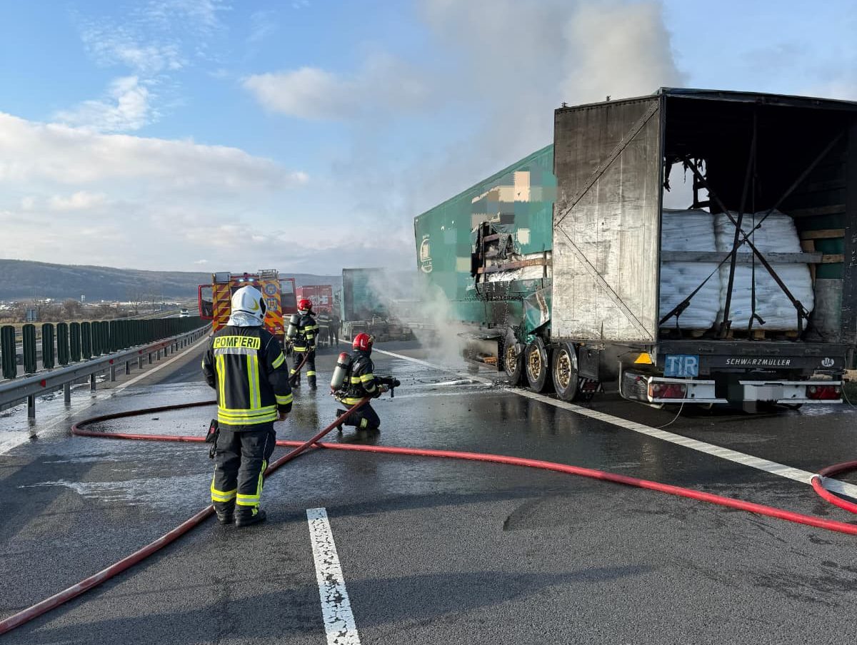 Un incendiu a izbucnit miercuri, în jurul orei 13:30, pe Autostrada A10, în zona Aiud. Focul a cuprins remorca unui camion.