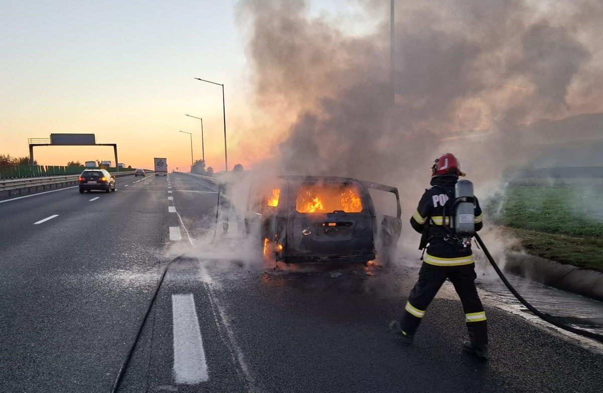 FOTO: Incendiu pe autostradă, pe sensul Sebeș – Orăștie: un autoturism a luat foc. Intervin pompierii
