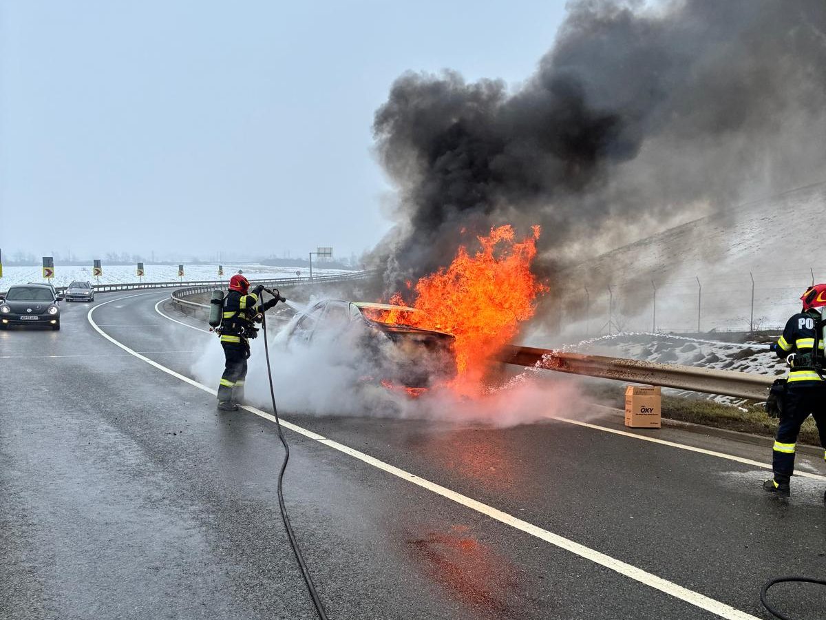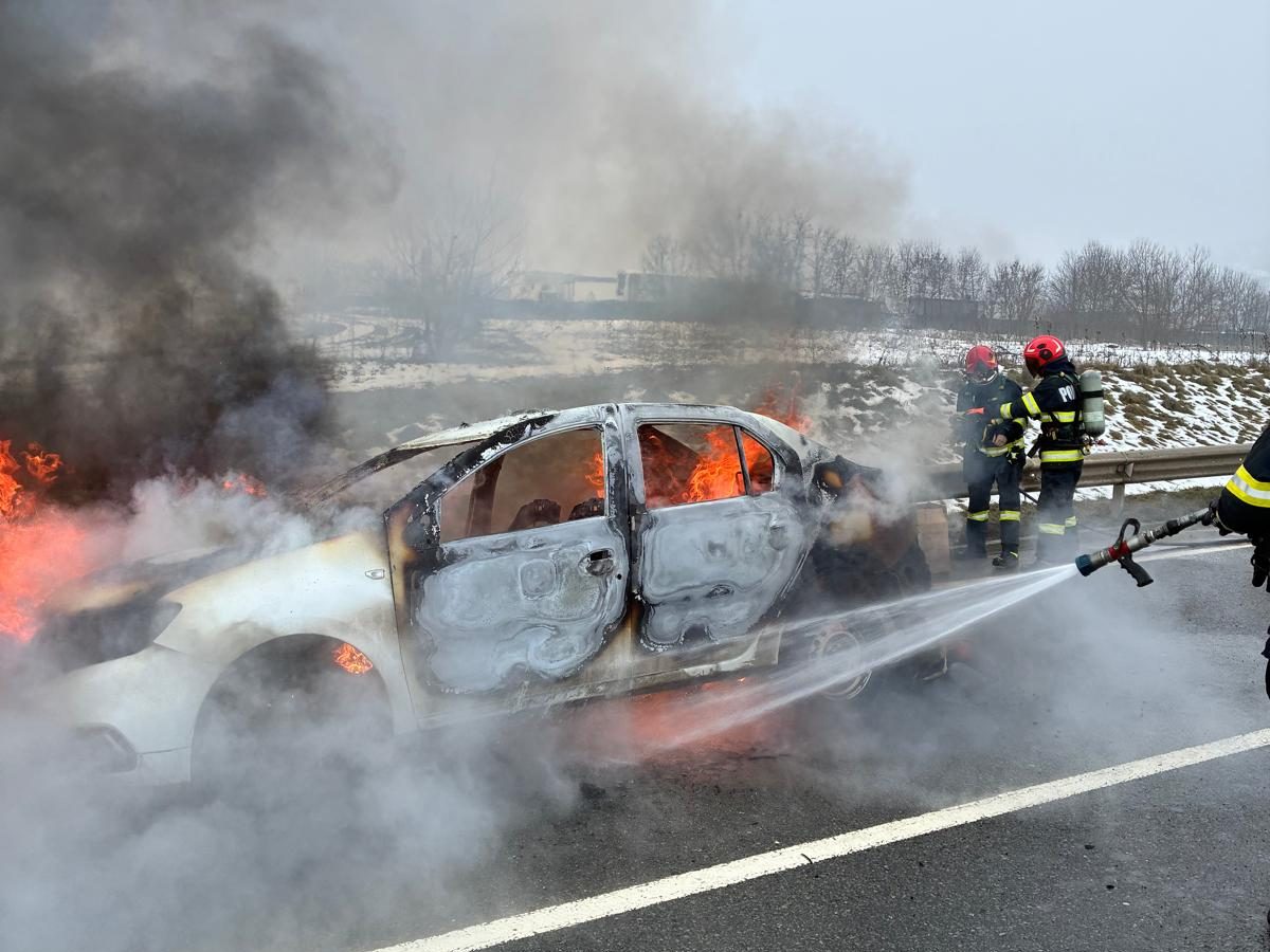 UPDATE FOTO INCENDIU la intrarea pe Autostrada A10 de la Aiud. Focul a mistuit un autoturism. Șoferița a suferit un atac de panică