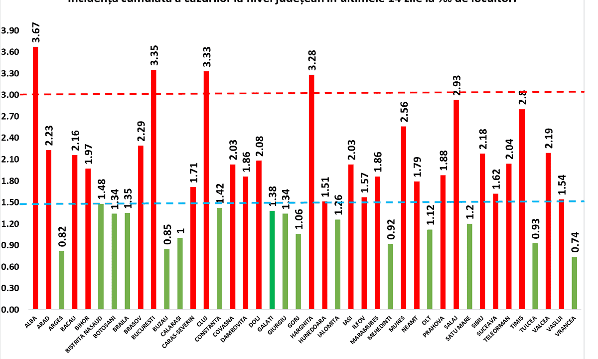 Potrivit acesteia, județul Alba rămâne pe primul loc cu incidență de 3,67 (anterior 3.54), București are 3,35 (anterior 3.33), iar Cluj are 3,33 (anterior 3.18). Incidență 3 are și Harghita, respectiv 3,28.