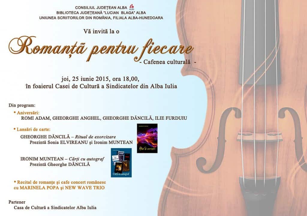 „Într-o seară de vară-o vioară cânta, / Aici lângă inima mea” – sunt versurile unei romanțe cu care Consiliul Județean Alba, Biblioteca Județeană ”Lucian Blaga” Alba, Uniunea Scriitorilor din România, filiala Alba-Hunedoara invită publicul la cafeneaua culturală a lunii iunie, adică la o „Romanță pentru fiecare”.