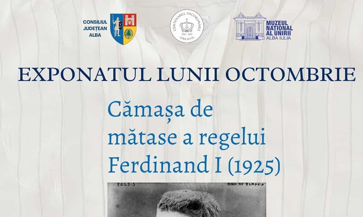 La Sala Unirii din Alba Iulia va avea loc joi, 6 octombrie, de la ora 11:00, vernisajul exponatului lunii octombrie: o cămașă de mătase care a aparținut regelui Ferdinand I (1925).