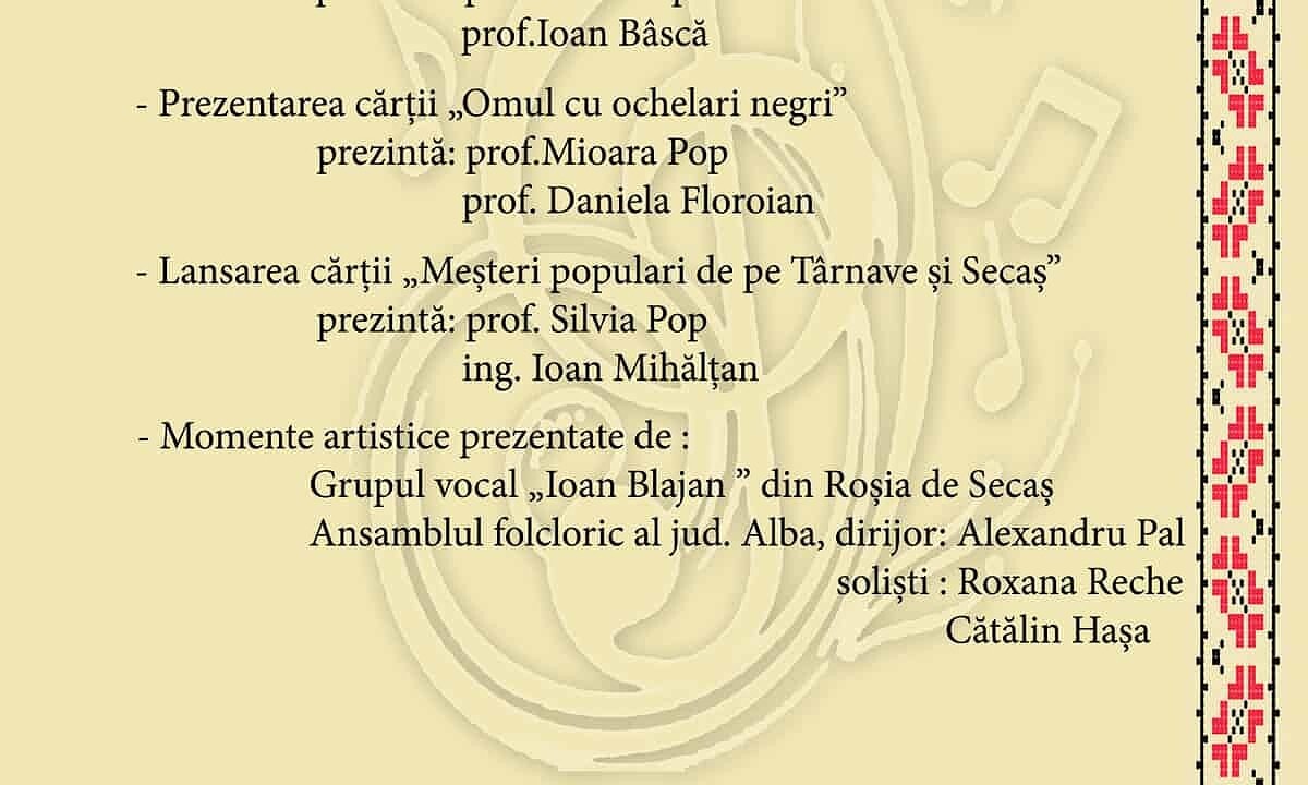 - lansarea cărții ”Meșteri populari de pe Târnave și Secaș”, prezintă prof. Silvia Pop, ing. Ioan Mihălțan