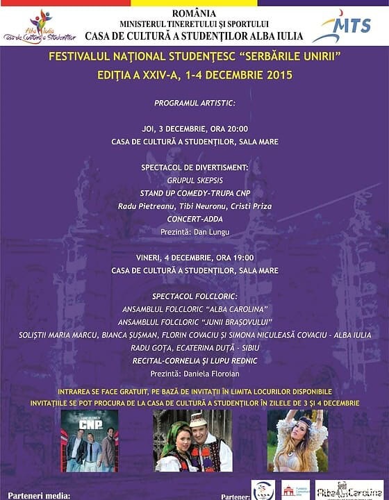 JOI și VINERI: „Serbările Unirii”, la Casa de Cultură a Studenților din Alba Iulia. Spectacole cu Radu Pietreanu, ADDA, Cornelia și Lupu Rednic