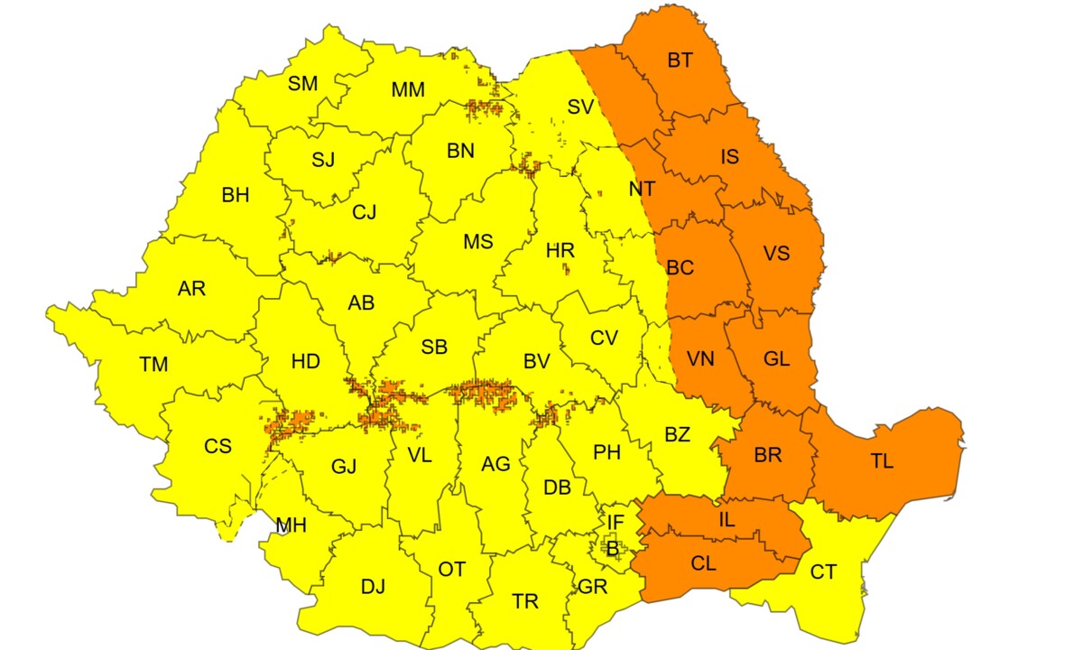 În ceea ce privește Codul Portocaliu de vânt acesta se manifestă până la ora 21.00, în Munții Apuseni, la altitudini mai mari de 1600 de metri, unde temporar vor fi intensificări puternice ale vântului, cu viteze la rafală de 100-120 de kilometri la oră.