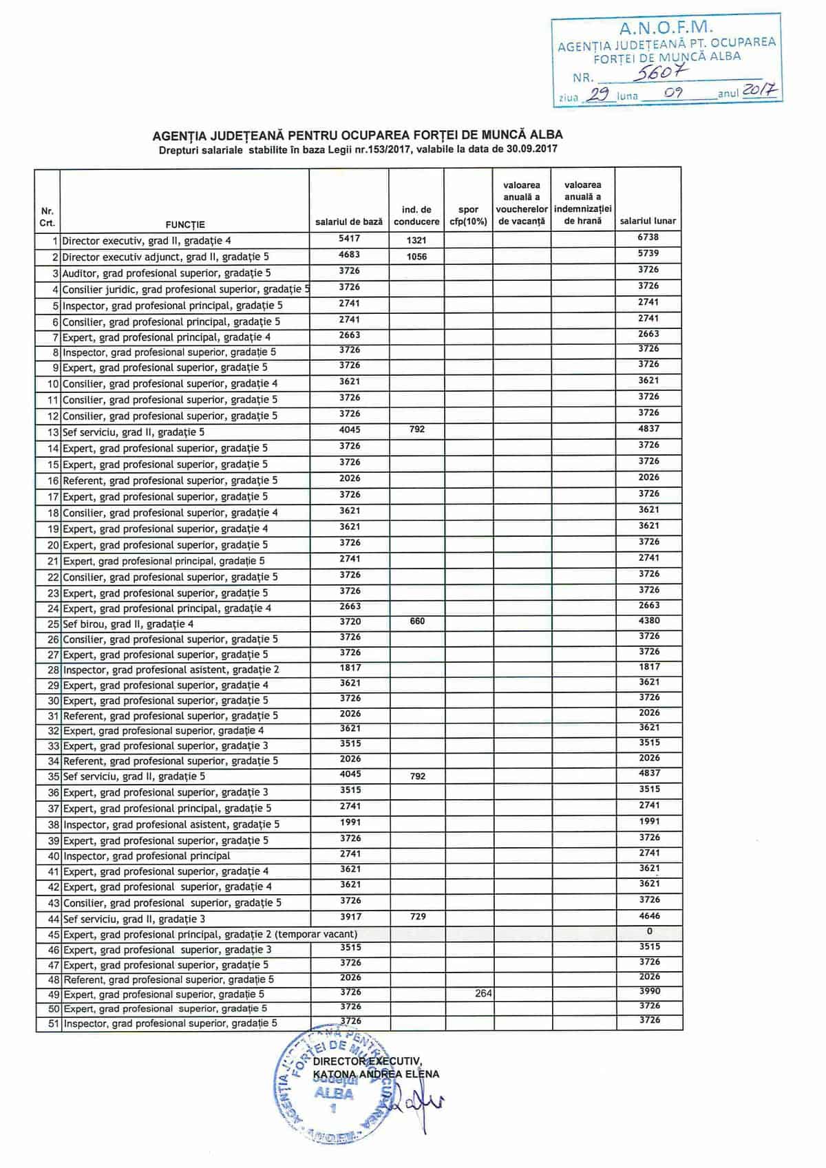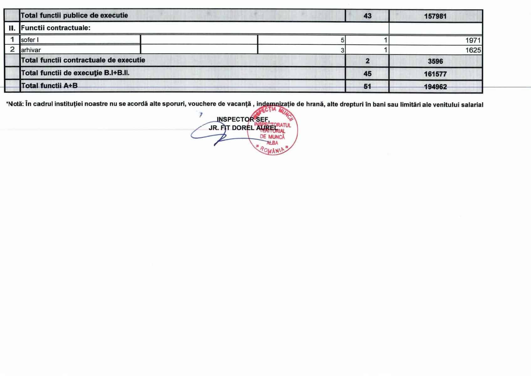Inspectoratul Teritorial de Muncă Alba a publicat lista cu veniturile angajaților. Inspectorul șef are uin salariu de bază de 6551 de lei, iar inspectorii de muncă între 3600 și puțin peste 4000. Instituția este cea care trebuie să verifice dacă celelalte autorități publice și-au publicat salariile aferente funcțiilor și, în caz contrar, să-i amendeze pe conducători cu sume cuprinse între 5000 și 10000 de lei.