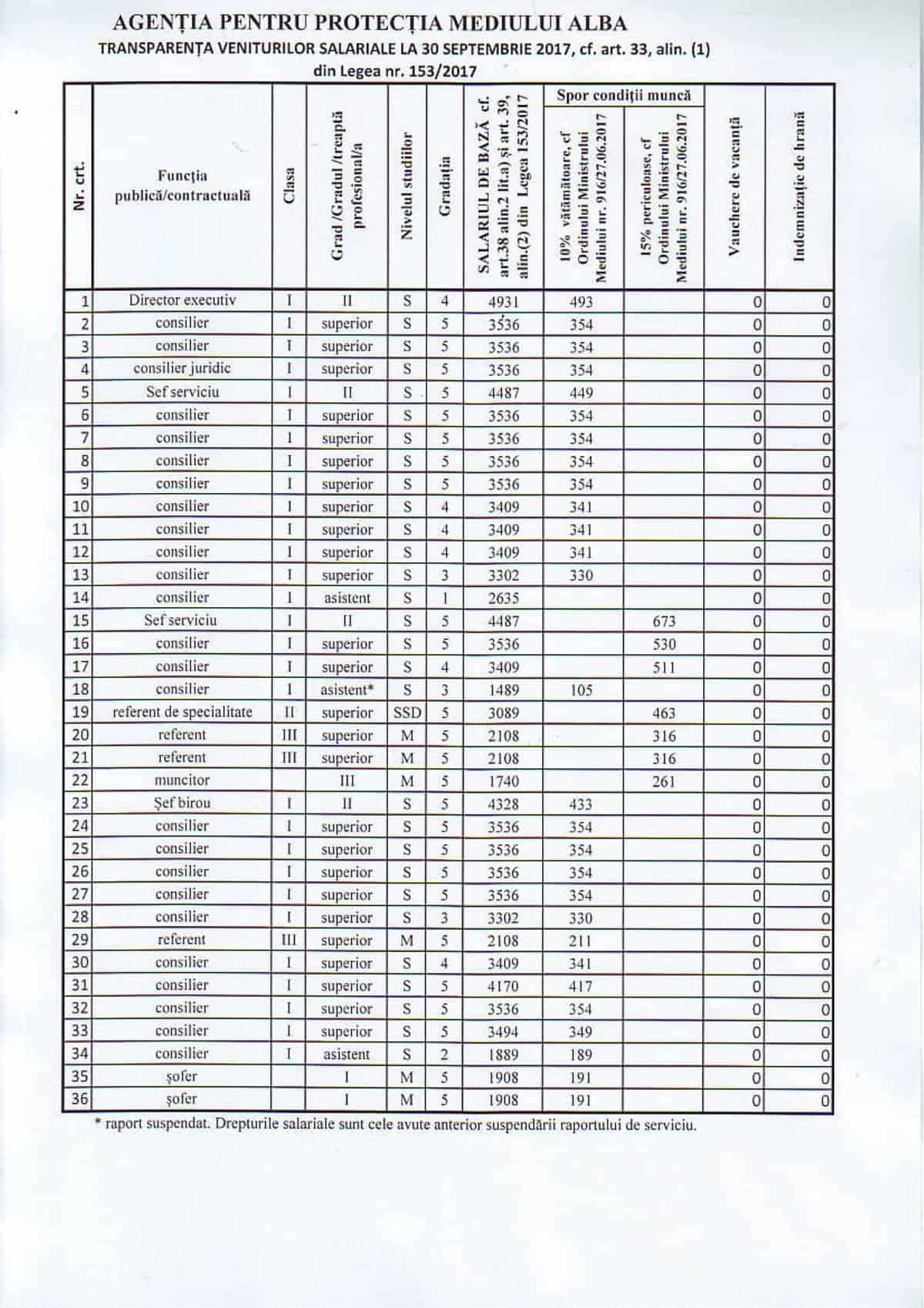 Listele cu veniturile angajaților fiecărei instituții trebuie publicate de două ori pe an, respectiv în 30 martie și 30 septembrie. Instituțiile publice din județul Alba ar fi trebuit să facă publice, până în data de 30 septembrie, lista cu salariile angajaților, în raport cu funcțiile pe care le ocupă. În caz contrar, Inspectoratul Teritorial de Muncă Alba poate amenda conducătorul instituției cu o sumă cuprinsă între 5.000 și 10.000 de lei.