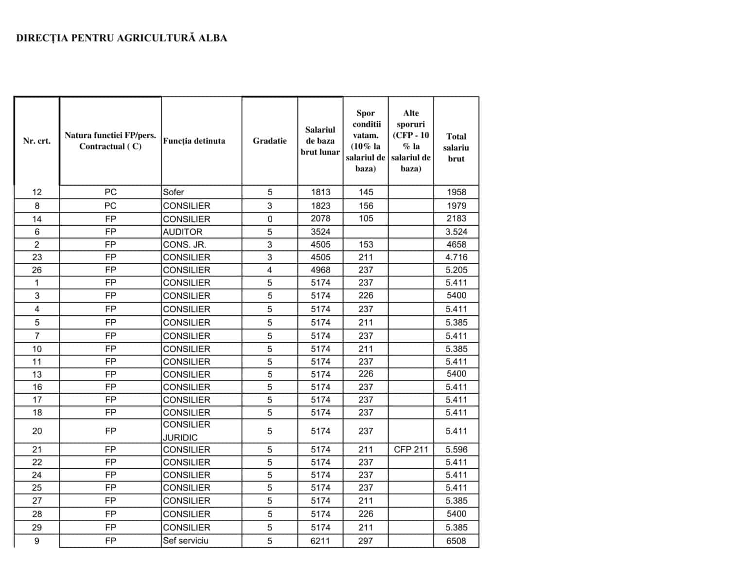 Directorul executiv al Direcției Agricole Alba, are un salariu de bază de 7207 lei, la care se adaugă un spor de condiții vătămătoare de 211 lei. Un consilier în cadrul instituției ajunge si el, cu sporuri, la peste 5.000 de lei. Șoferul direcției câștigă și el 1813 lei, venit de bază, la care se adaugă 145 de lei spor de condiții vătămătoare.