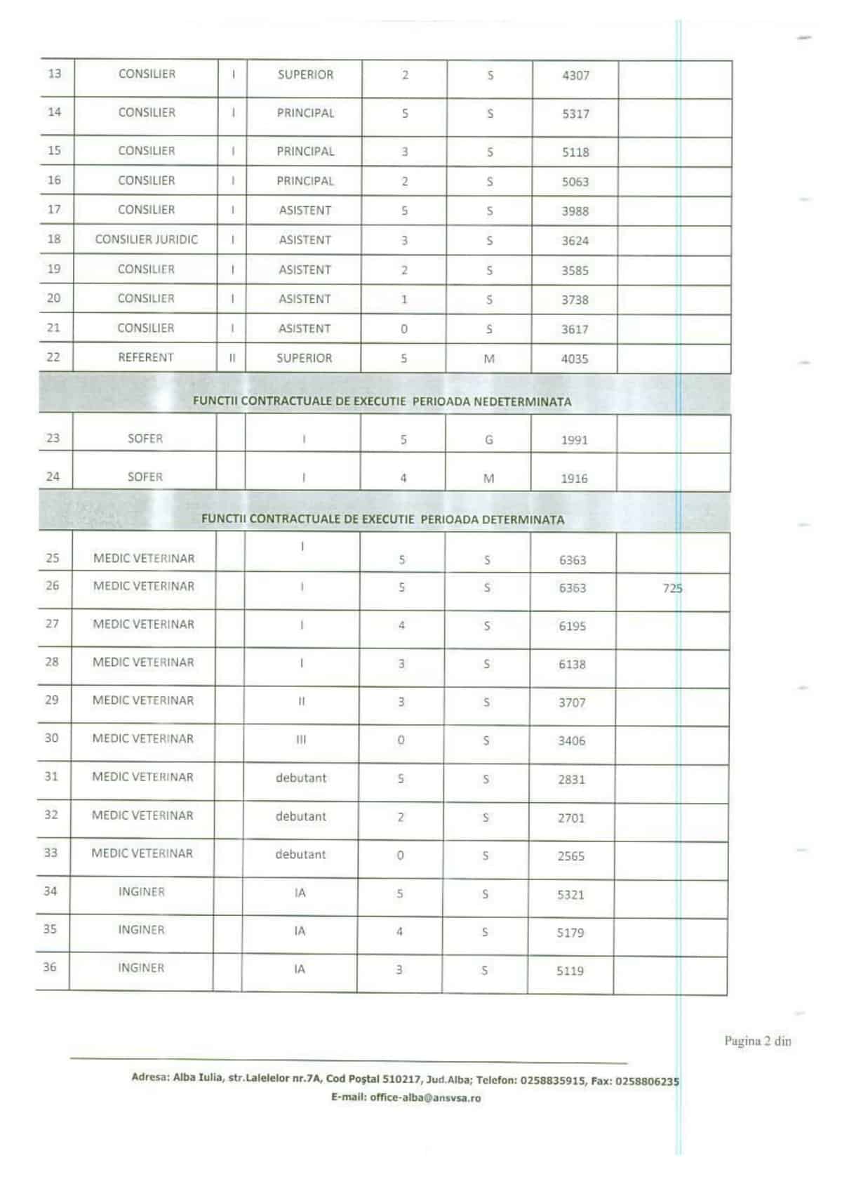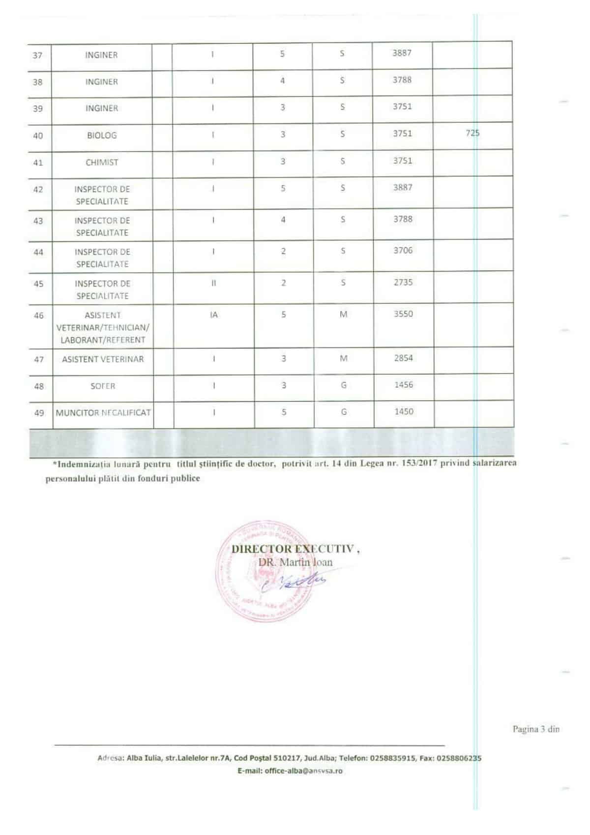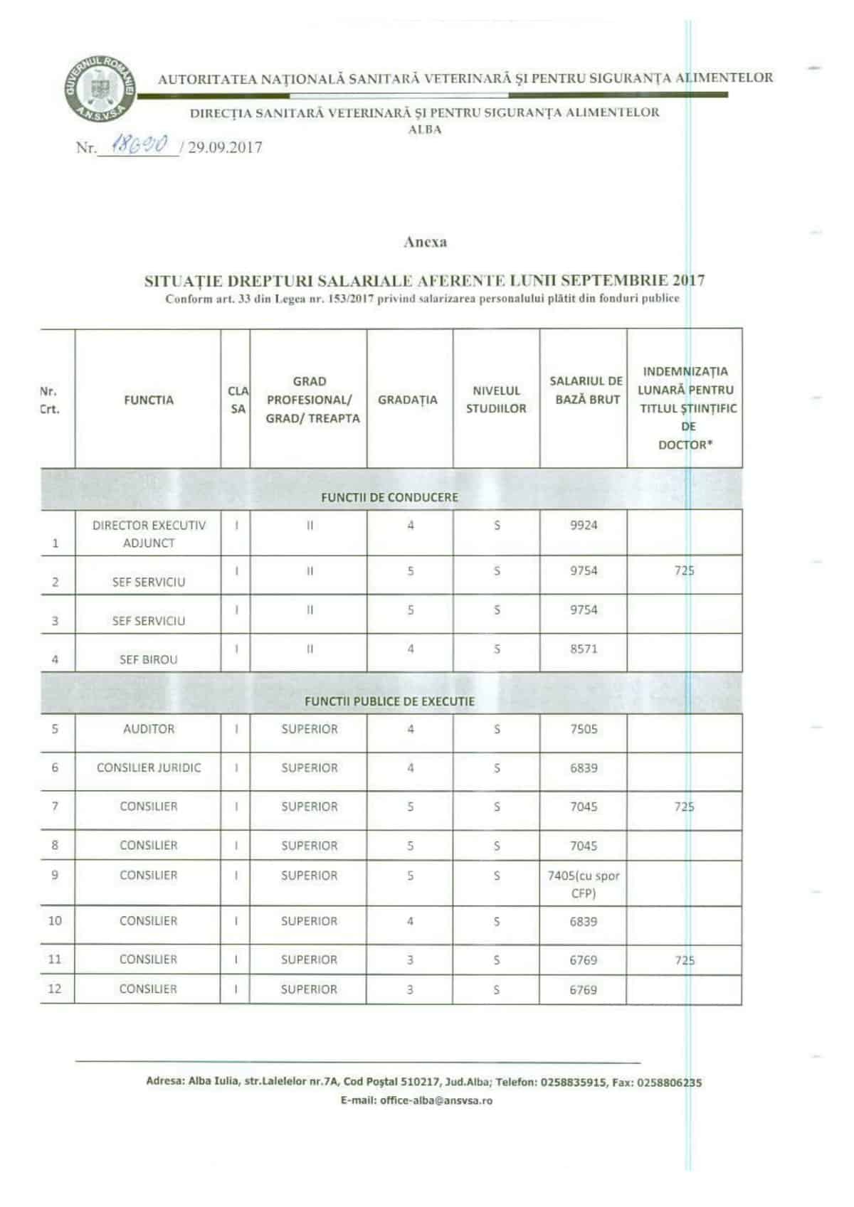 Direcția Sanitar Veterinară Alba a publicat veniturile salariaților, mai puțin acela al directorului. Regăsim în schimb informația că directorul adjunct are un venit de bază de 9924 de lei iar un șef de serviciu 9754, la care se adaugă un spor de doctorat de 725 de lei.