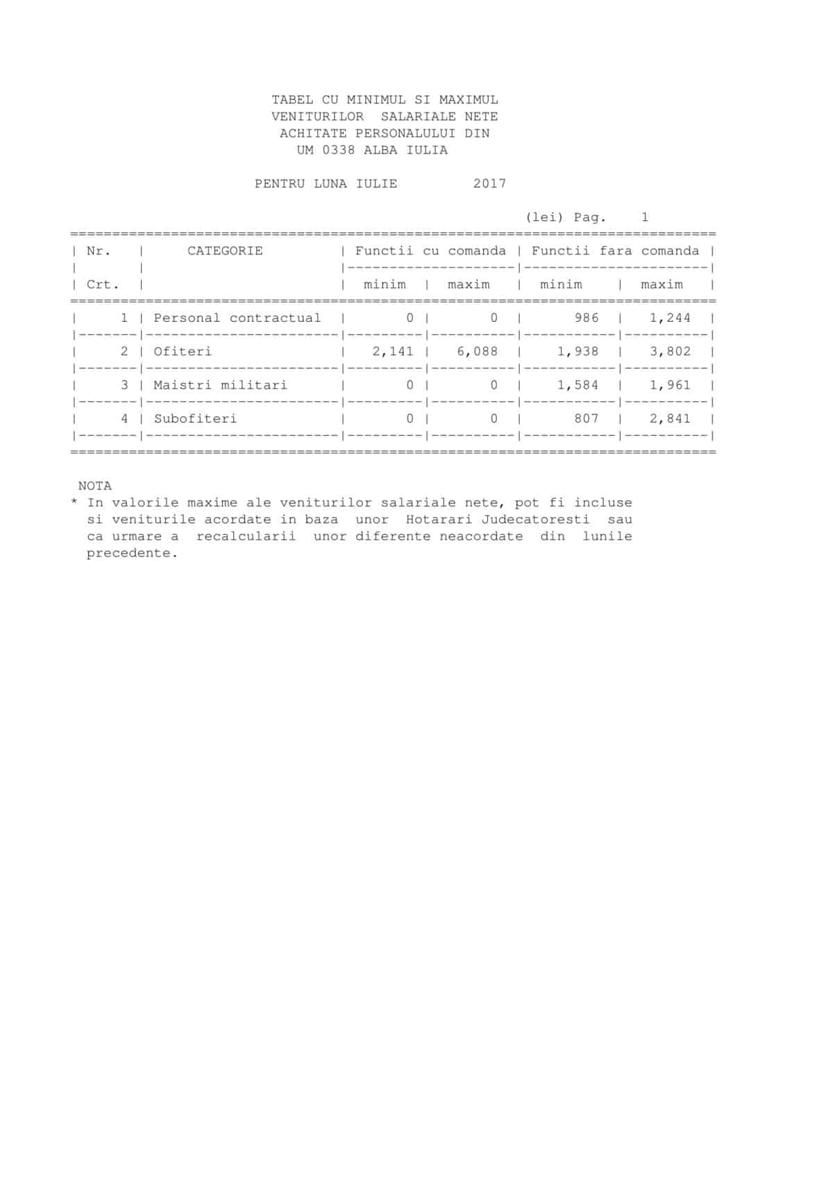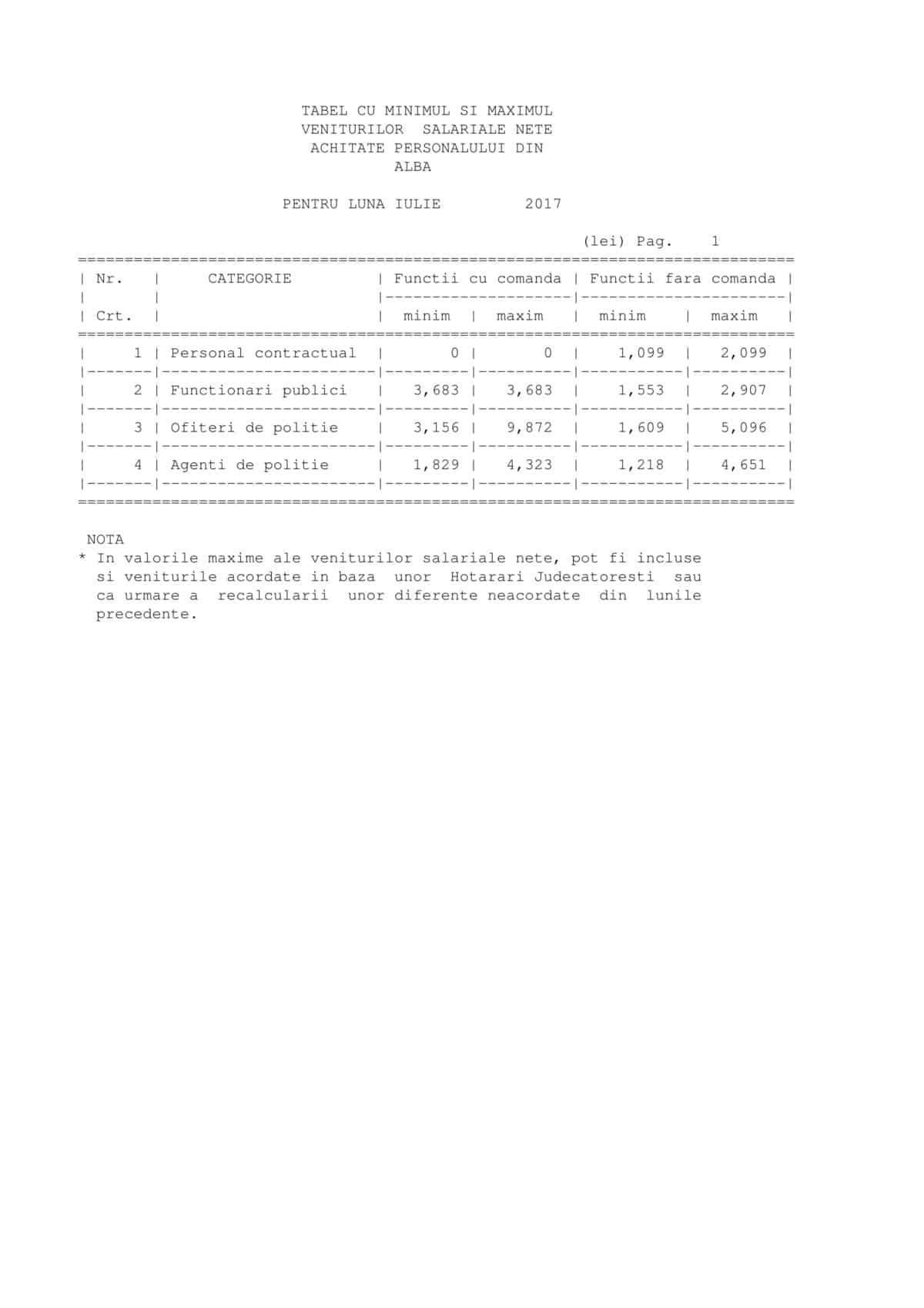 Inspectoratul Județean de Poliție Alba, a decis că respectă legea publicând pur și simplu un tabel cu minimul și maximul veniturilor salariale nete, achitate personalului în luna iulie. Nici vorbă de veniturile aferente fiecărei funcții din cadrul aparatului. Personalul contractual angajat al instituției câștigă minim 1099 lei și maxim 2099 de lei. Funcționarii publici angajați ai instituției pot câștiga până la 3683 de lei, iar ofițerii de poliție până la 5096 de lei. Potrivit informațiilor furnizate câștigă minim 1829 de lei și maxim 4651 de lei. Instituția nu precizează care sunt funcțiile din instituție și câți bani revin fiecăreia. De asemenea, nu se vorbește despre sporuri.