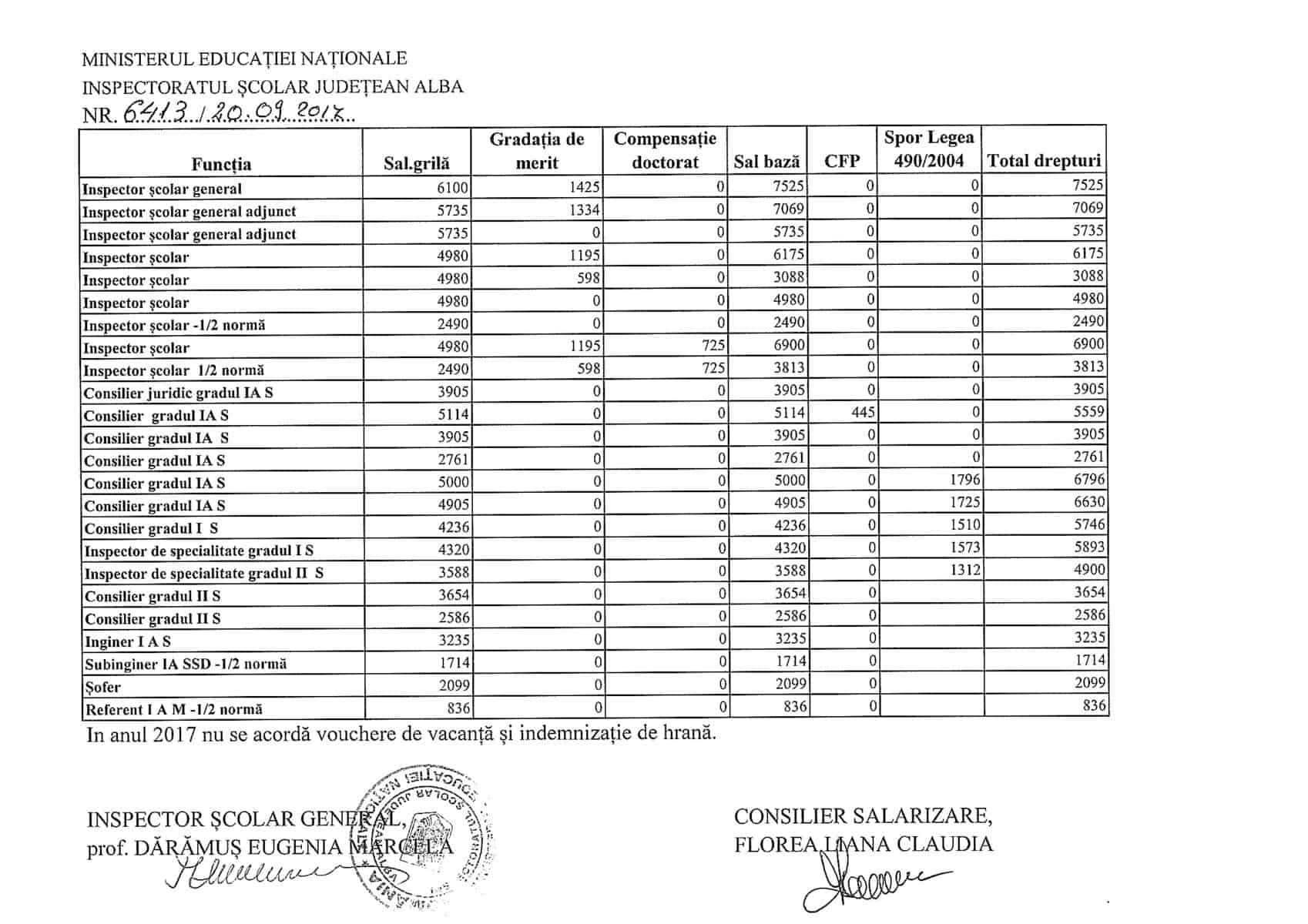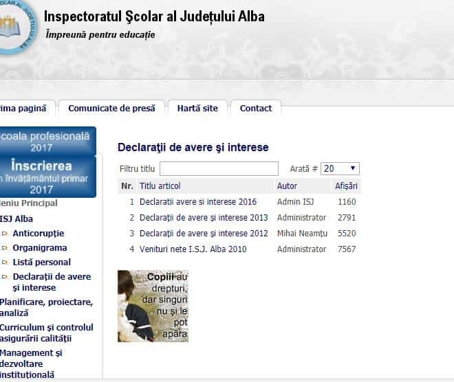 UPDATE: Inspectorul șef al Inspectoratului Școlar Județean, Marcela Dărămuș, ne-a anunțat că informațiile au fost postate pe siteul instituției și că nu le-am văzut noi. Întradevăr, nu le-am văzut. Erau pe www.isj.albanet.ro, urmând linkurile compartimente/salarizare-normare/ venituri salariale conform art 33 etc. Să revenim: inspectorul șef al IȘJ are un venit lunar de bază de 6100 de lei, la care se adaugă o gradație de merit de 1425, cu care ajunge la 7525 de lei. Un inspector școlar are, la rândul său, un salariu de bază de 4980 de lei. Există un caz în listă care beneficiază de salariu de merit de 1195 de lei, la care se adaugă spor pentru doctorat de 720 de lei, ajungând la 6900 de lei.