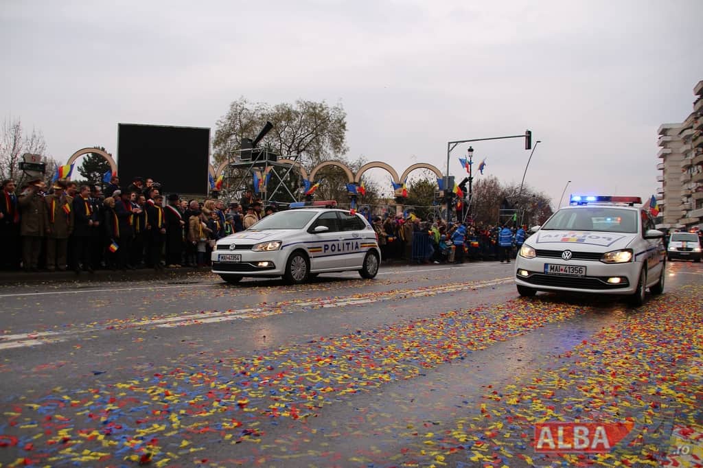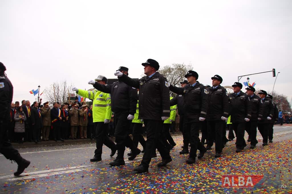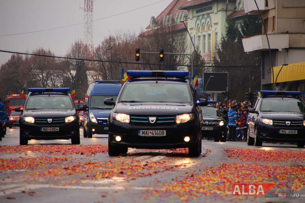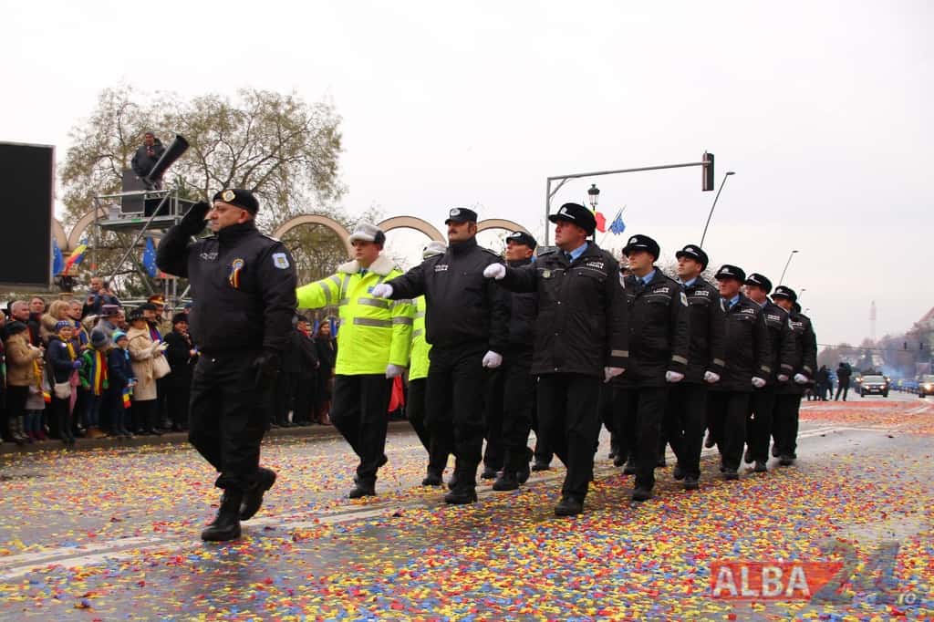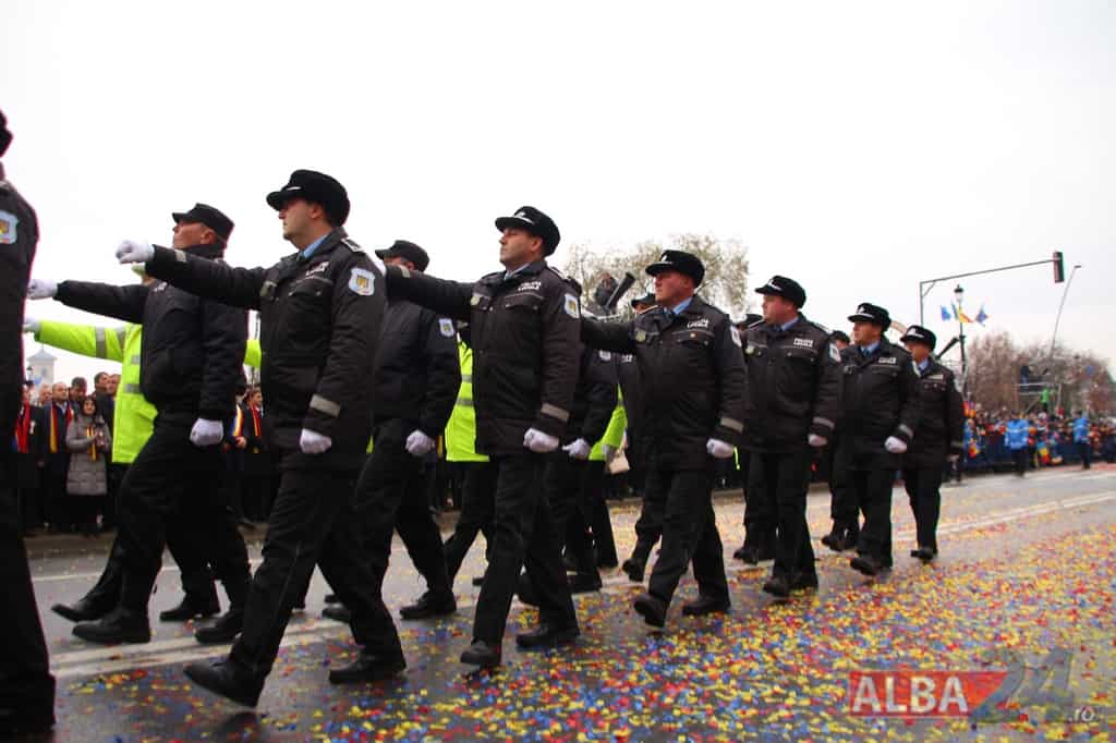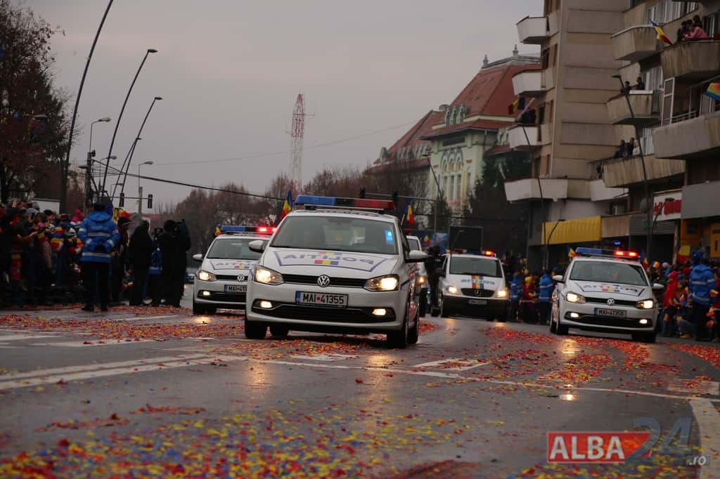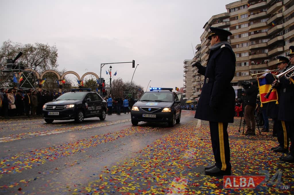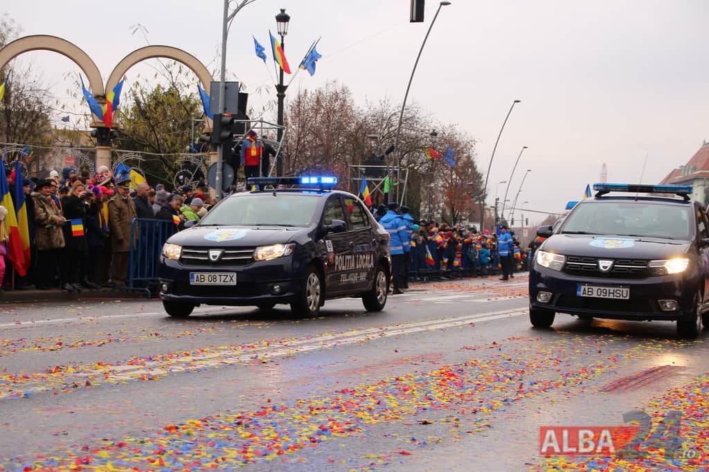 Prin faţa participanţilor la sărbătoarea naţională, în Capitala Marii Uniri, au defilat cadre MApN şi MAI - aproximativ 400 de oameni, fiind prezentate şi autospeciale, militare şi de la Poliţie, ISU, jandarmi, SRI şi Poliţia Locală.