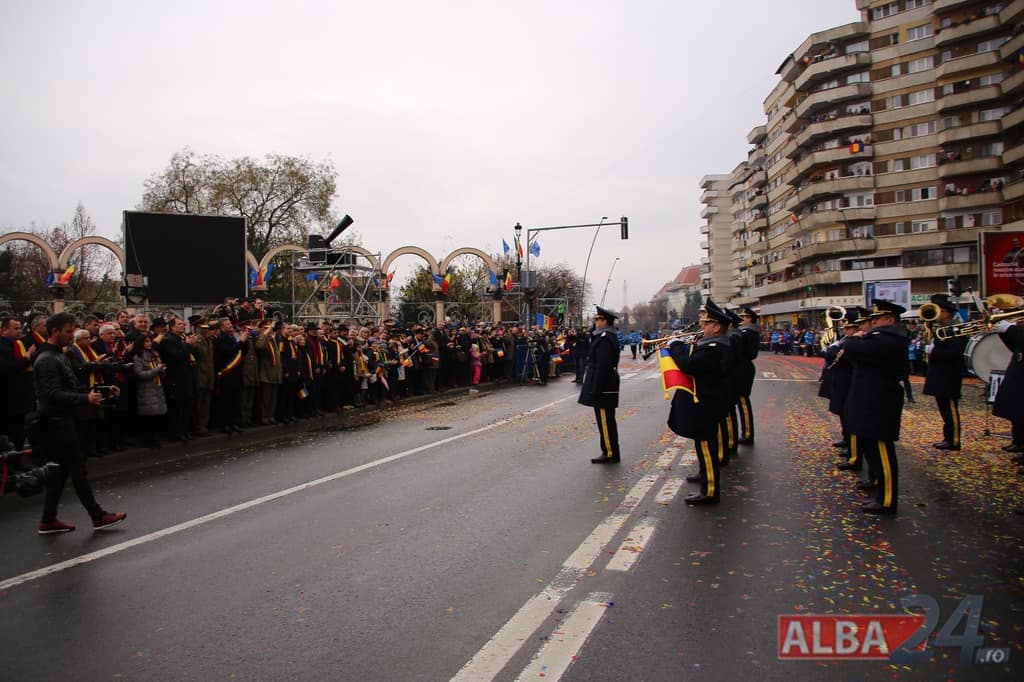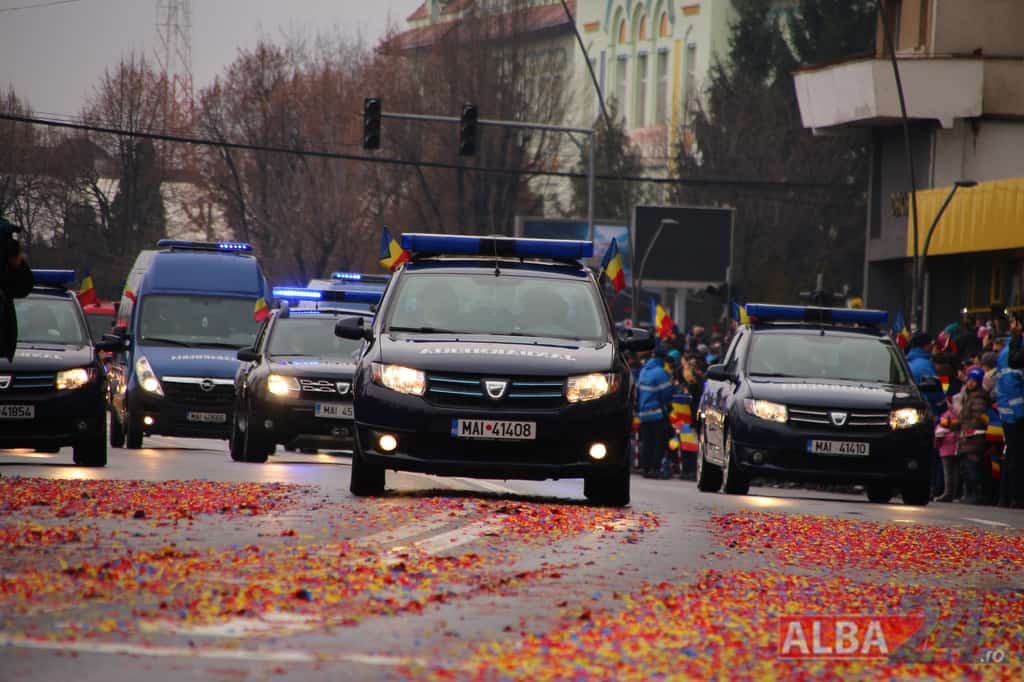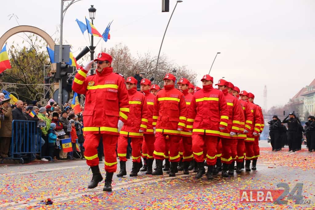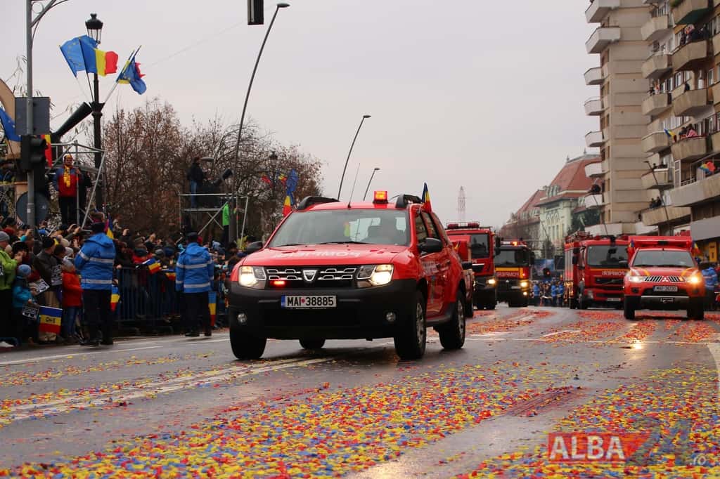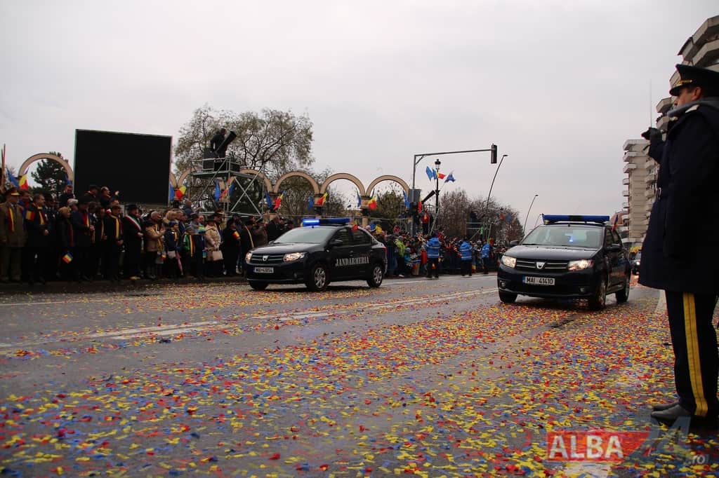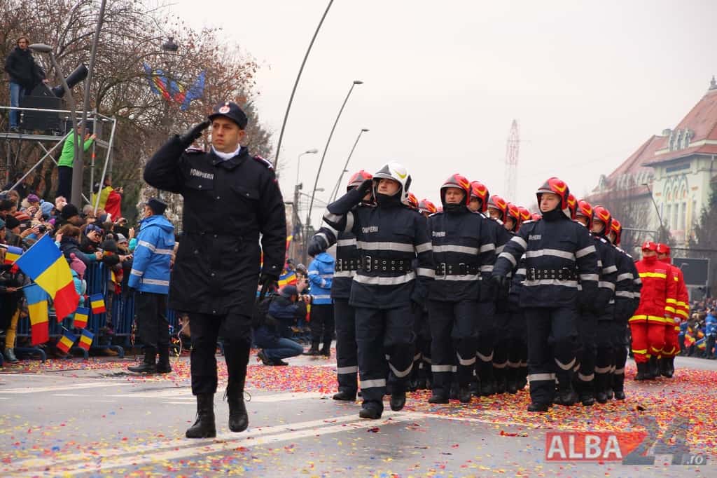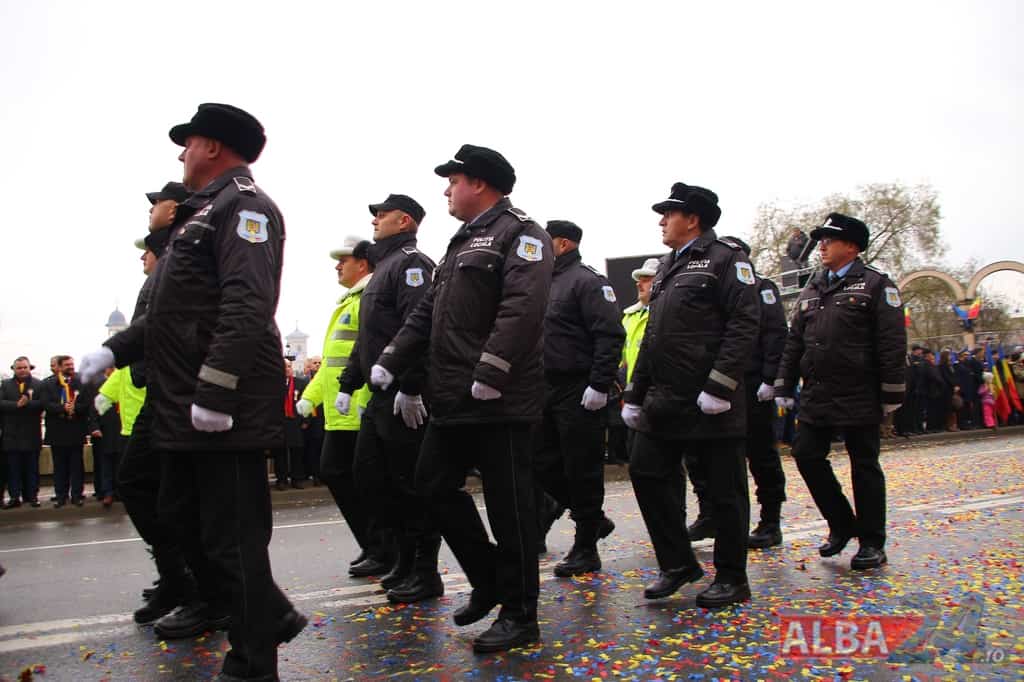 Prin faţa participanţilor la sărbătoarea naţională, în Capitala Marii Uniri, au defilat cadre MApN şi MAI - aproximativ 400 de oameni, fiind prezentate şi autospeciale, militare şi de la Poliţie, ISU, jandarmi, SRI şi Poliţia Locală.