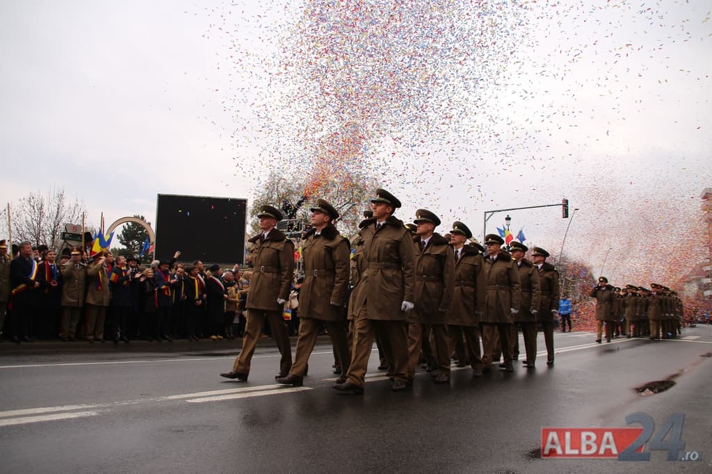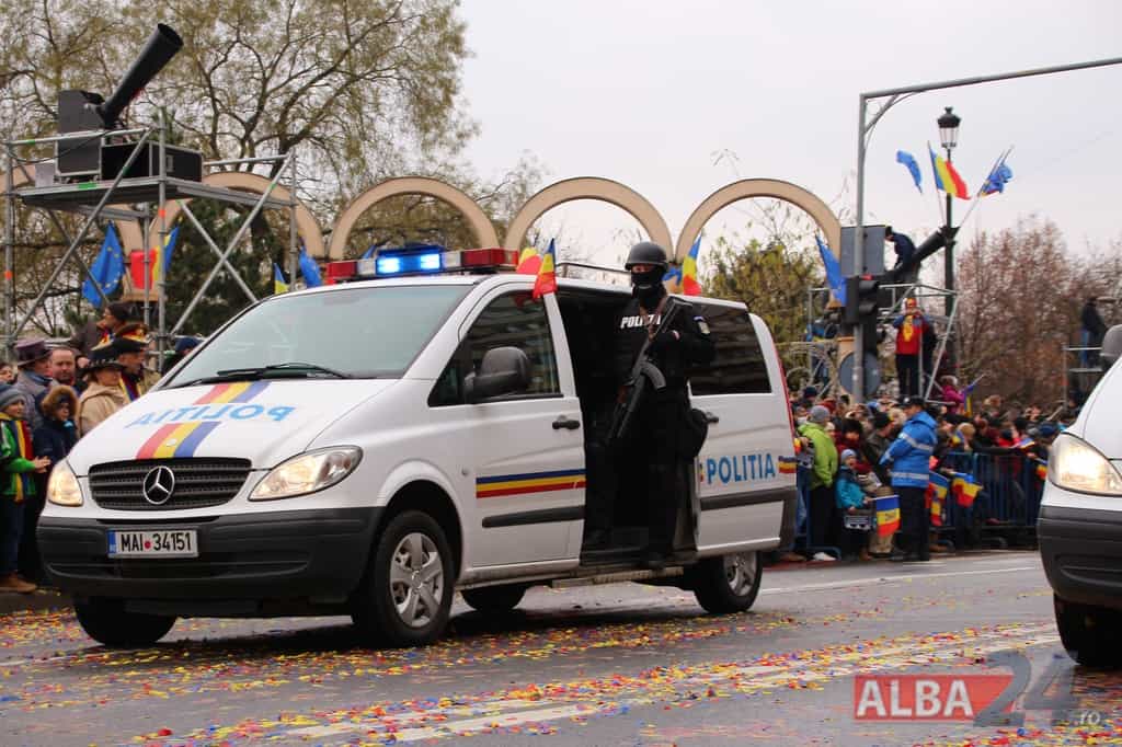 Prin faţa participanţilor la sărbătoarea naţională, în Capitala Marii Uniri, au defilat cadre MApN şi MAI – aproximativ 400 de oameni, fiind prezentate şi autospeciale, militare şi de la Poliţie, ISU, jandarmi, SRI şi Poliţia Locală.