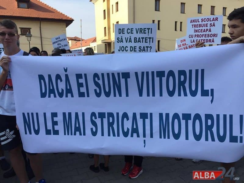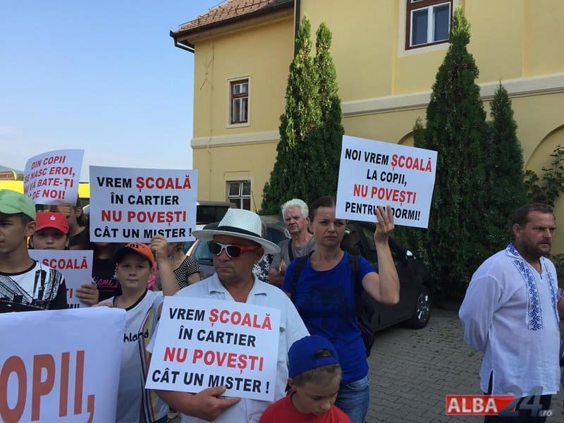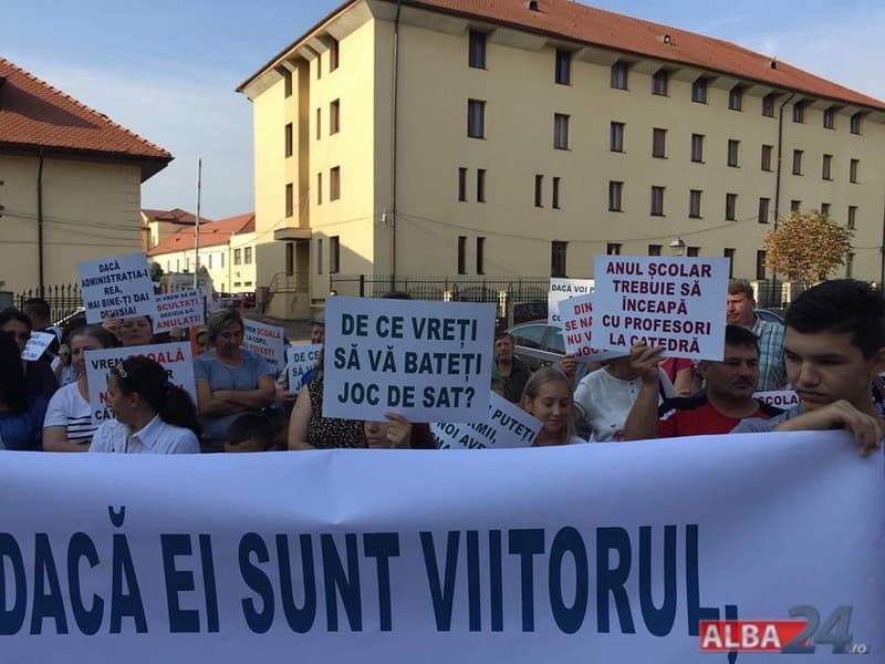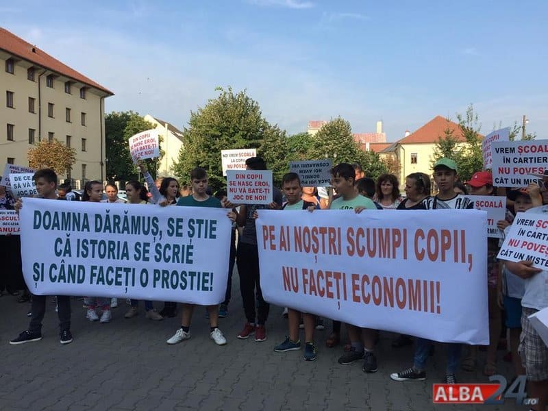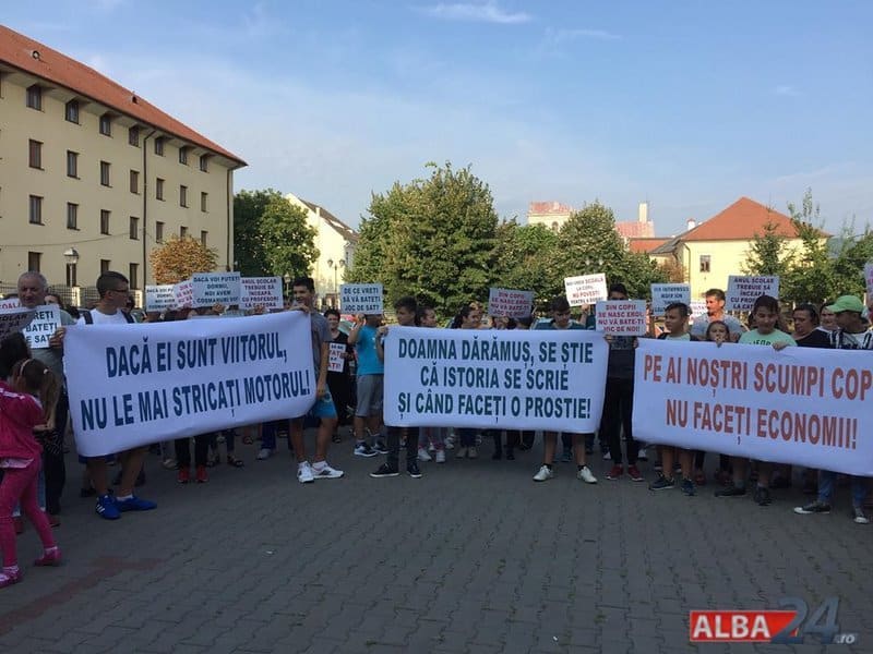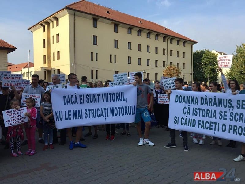 Între timp a apărut un ordin de ministru, iar părinții au fost chemați să își înscrie copiii la Alba Iulia. Vineri dimineața, zeci de părinți și elevi au venit pentru a protesta în fața Inspectoratului Școlar Județean Alba. Pe pancarte protestatarii au scris: „Dacă ei sunt viitorul, nu le mai stricați motorul!”, „Doamna Dărămuș, se știe că istoria se scrie și când faceți o prostie!”, „Pe ai noștrii scumpi copii nu faceți economii!”.