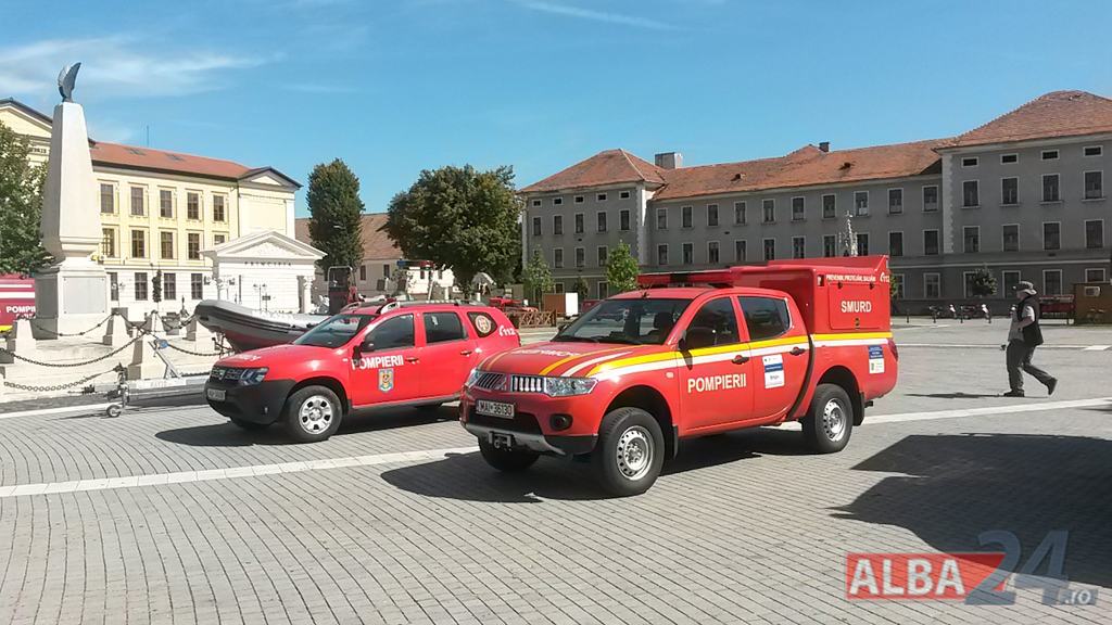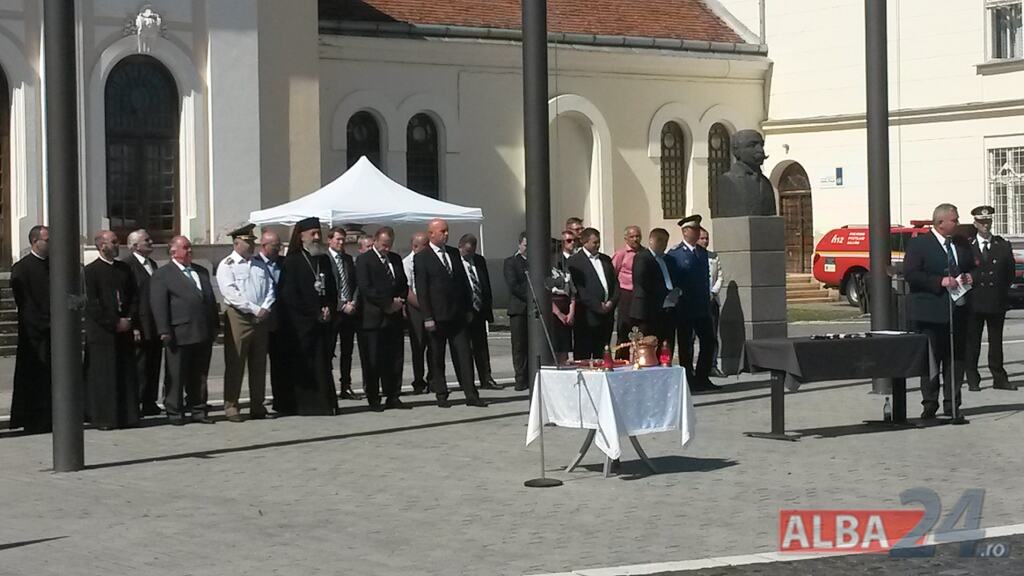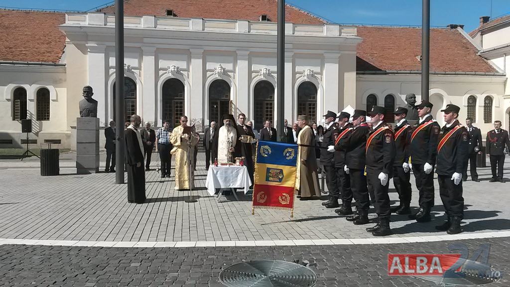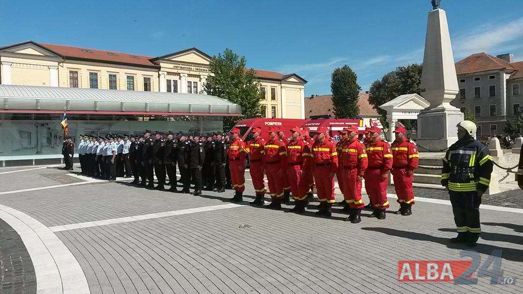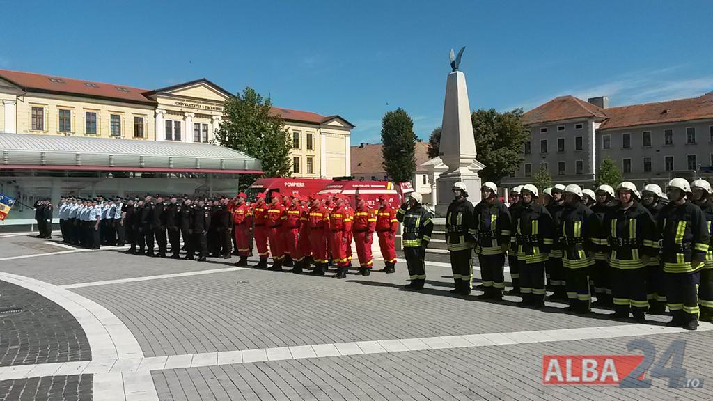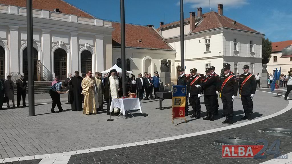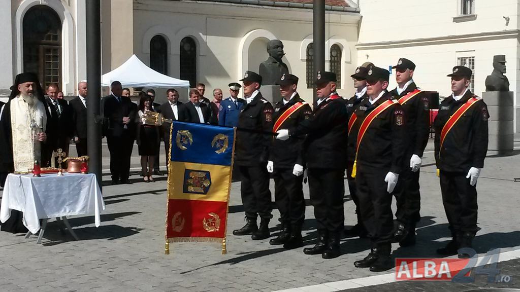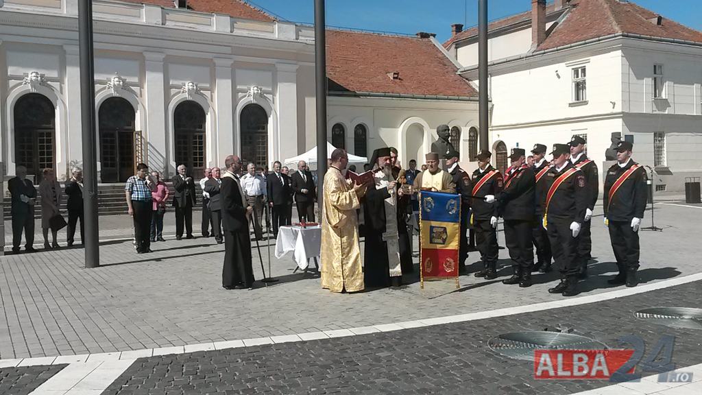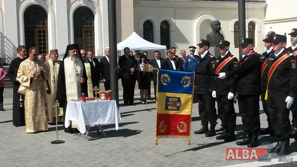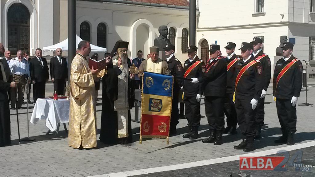 FOTO-VIDEO: Sfințirea noului Drapel de Luptă al ISU Alba, la Alba Iulia. Ceremonial militar și religios, expoziție de tehnică și exerciții demonstrative