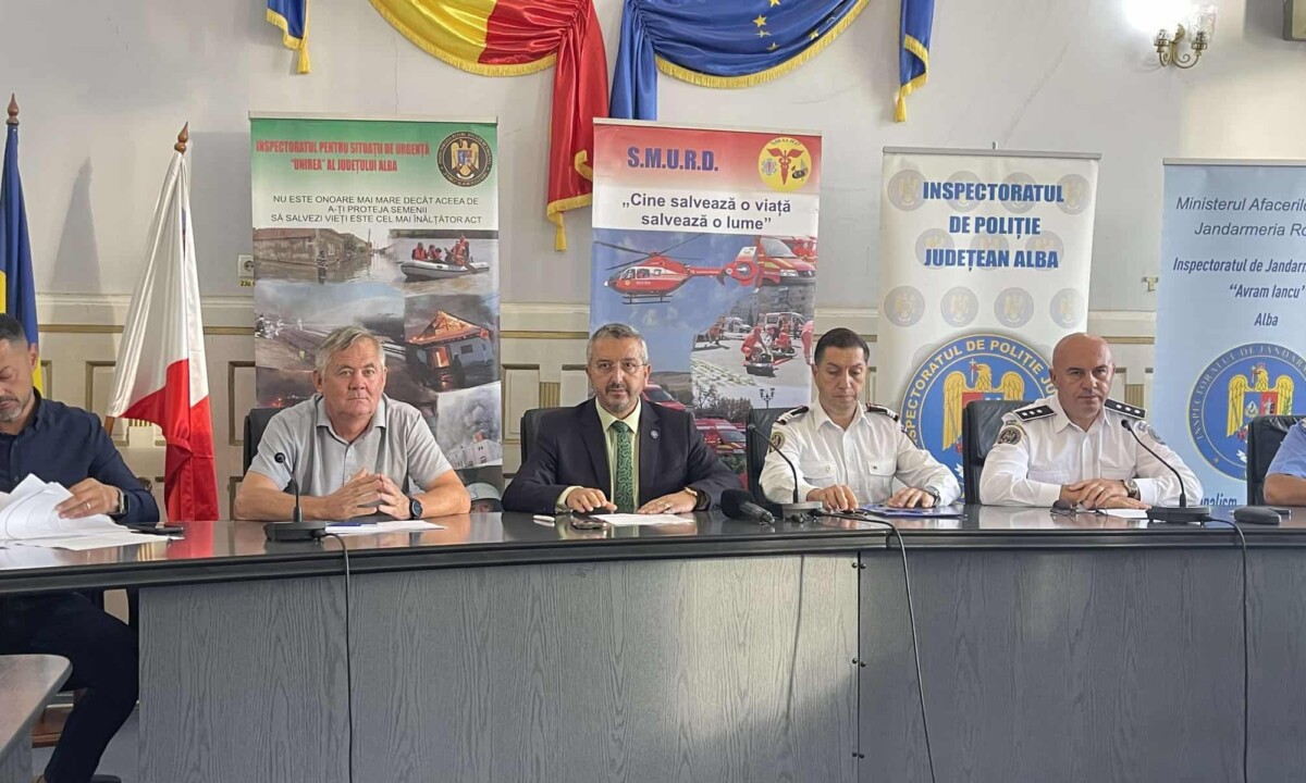 La conferința de presă organizată vineri la sediul Instituției Prefectului – Județul Alba participă prefectul Nicolae Albu, inspectorul școlar adjunct al ISJ Alba, Dan Cherecheș, directorul DSP Alba, Alexandru Sincea, adjunct al șefului IPJ Alba, cms. șef Mihai Rus, inspectorul șef al ISU Alba, col. Ovidiu Costea și adj. al IJJ Alba, col. Cosmin Jurcoveț.