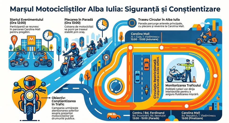 Începând cu ora 12.00, motocicliștii se vor reuni în parcarea Carolina Mall din Alba Iulia.