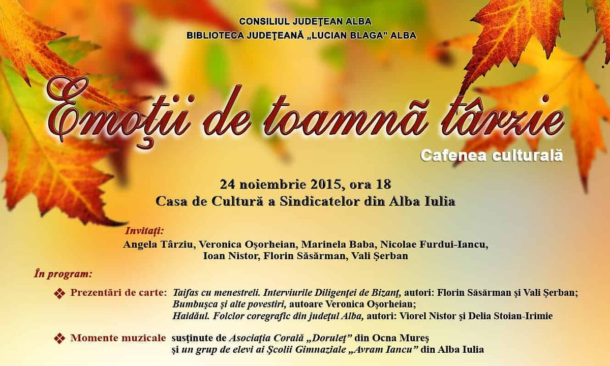 MARȚI | „Emoții de toamnă târzie”: Cafenea culturală, lansări de carte și momente muzicale, la Casa de Cultură a Sindicatelor din Alba Iulia