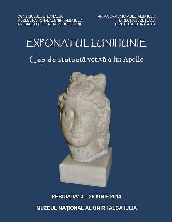 Este vorba despre capul unei statuete din marmură, cu caracter votiv, care-l reprezintă pe Apollo, un important zeu al panteonului religios greco-roman. Opera sculpturală aparține epocii romane și a fost achiziționată în anul 1900 de către Adalbert Cserni, primul custode și director al Muzeului din Alba Iulia.