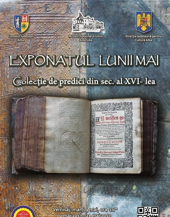 Marți, 9 mai de ora 11:00 la Muzeul Naţional al Unirii Alba Iulia va avea loc vernisajul mini-expoziţiei „Exponatul lunii mai”. Cu această ocazie va fi expusă o colecție de predici din secolul al XVI-lea.