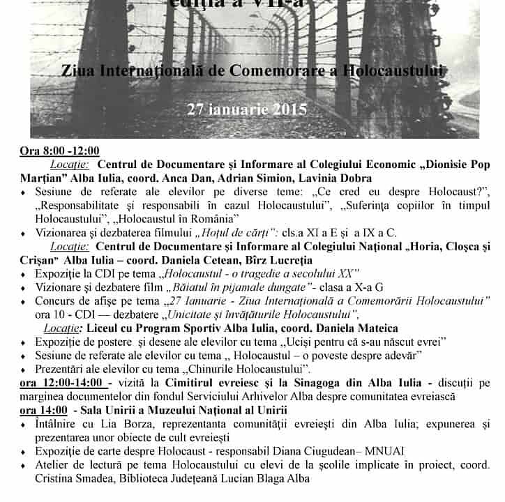 Din programul evenimentului vor face parte expoziții, prezentări și sesiuni de referate ale elevilor, vizionare și dezbatere filme, concurs de afișe dar și vizite la Cimitirul evreiesc și la Sinagoga din Alba Iulia.