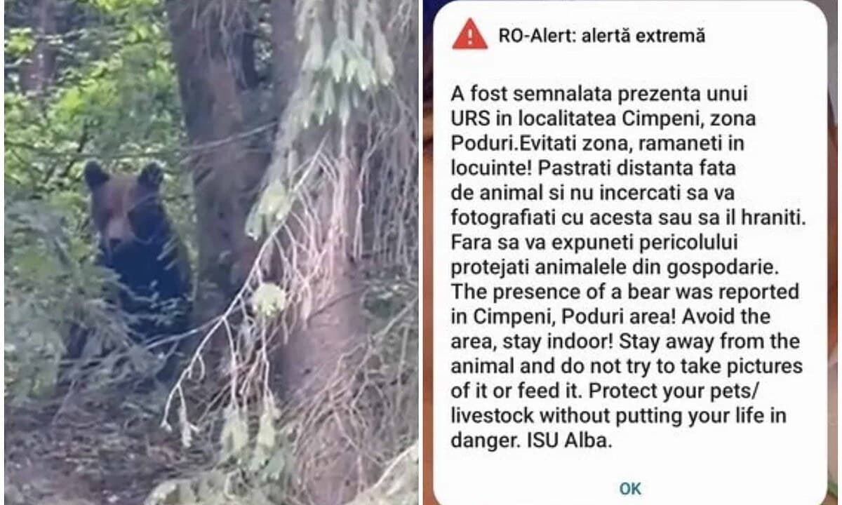 O nouă avertizare prin sistemul RO-Alert, care semnealează prezența unui urs în orașul Câmpeni, a fost emisă sâmbătă dimineața de autorități. Animalul a fost văzut în zona Poduri, în jurul orei 9:00.