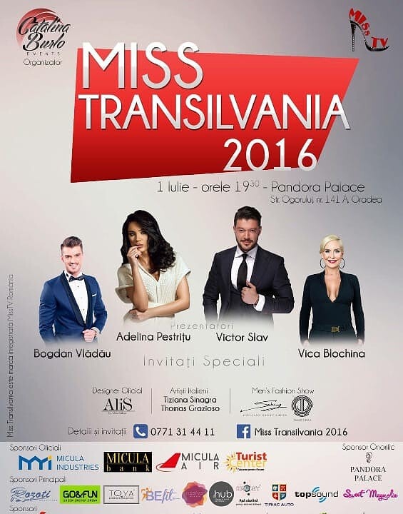 Miss Transilvania 2016, îi va avea ca prezentatori pe Adelina Pestrițu şi Victor Slav, dar şi invitați speciali precum Bogdan Vlădău şi Vica Blochina.