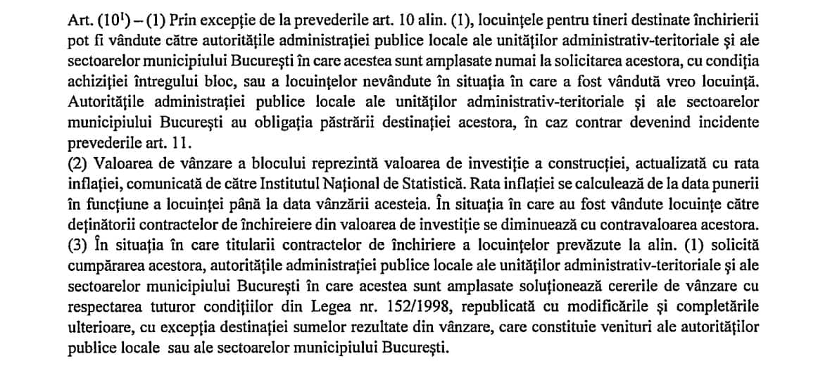 "Prin excepţie, locuinţele pentru tineri destinate închirierii vor putea fi vândute către autorităţile administraţiei publice locale ale unităţilor administrativ-teritoriale şi ale sectoarelor municipiului Bucureşti în care acestea sunt amplasate numai la solicitarea acestora, cu condiţia achiziţiei întregului bloc sau a locuinţelor nevândute în situaţia în care a fost vândută vreo locuinţă", mai stipulează proiectul.