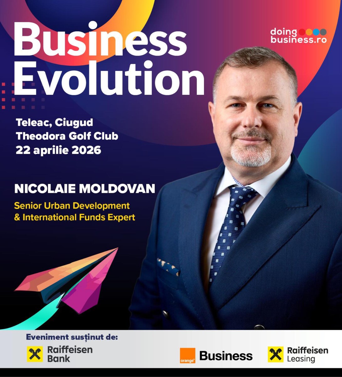 Nicolaie Moldovan, fostul city manager al municipiului Alba Iulia și expert în fonduri internaționale, va participa miercuri, 22 aprilie 2026 la evenimentul Business Evolution – Creștere. Transformare. Adaptare. Este vorba despre un eveniment care se desfășoară la Teleac, Ciugud, la Theodora Golf Club.