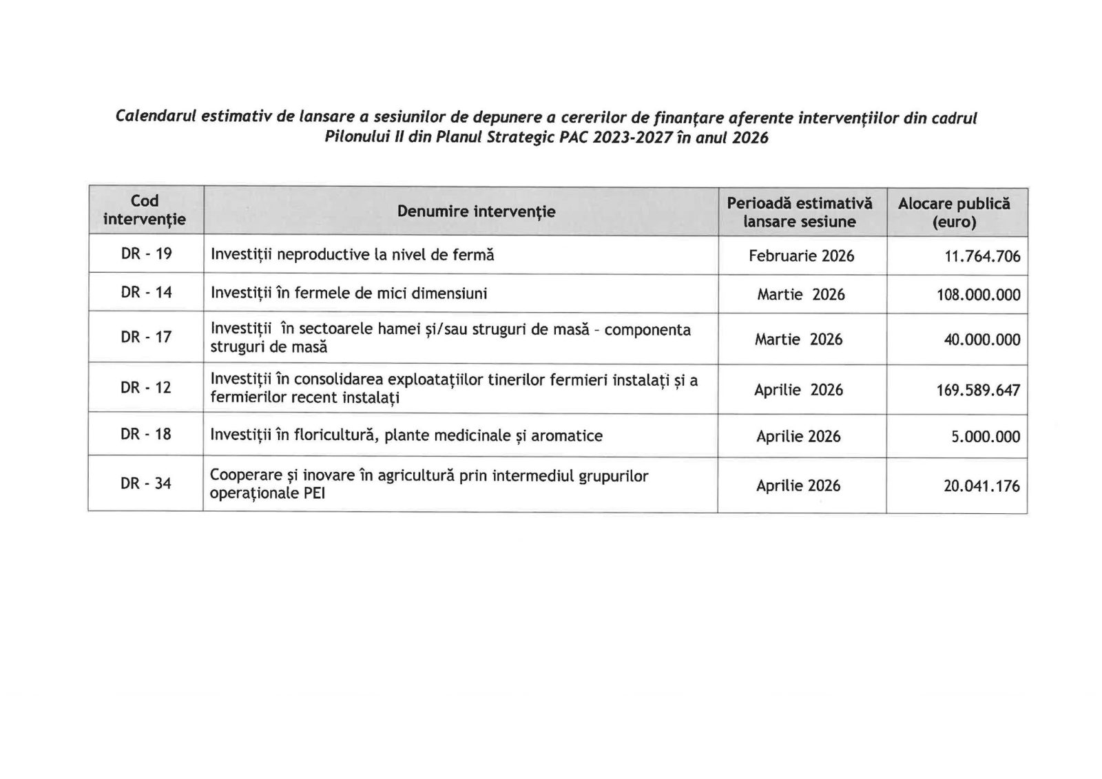 Alocarea financiară stabilită pentru această sesiune este de 151.383.529 euro, împărțită astfel: