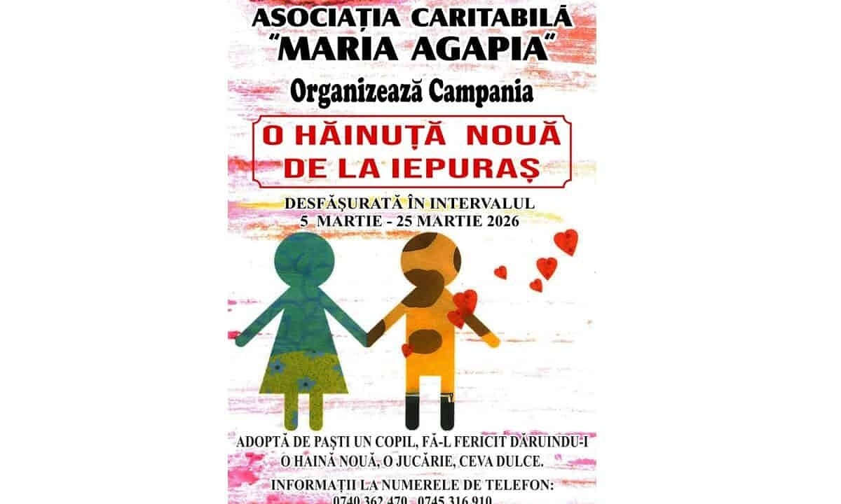 În preajma sărbătorilor pascale, când copiii așteaptă cu nerăbdare cadoul iepurașului, Asociația „Maria Agapia” din Aiud organizează o campanie caritabilă: „O hăinuță nouă de la Iepuraș”.