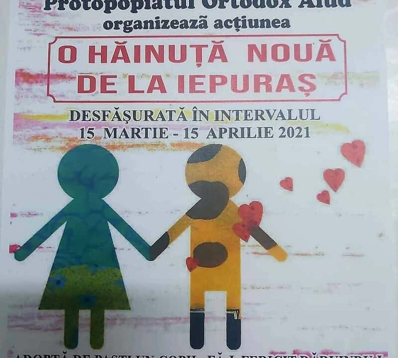 Asociația „Maria Agapia” Aiud, în parteneriat cu Protopopiatul Ortodox din Aiud, organizează o campanie de colectare de donatii pentru copii denumită „O hăinuță nouă de la Iepuraș”.