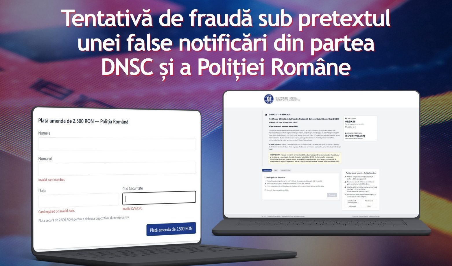 Directoratul Național de Securitate Cibernetică (DNSC) avertizează asupra unor tentative de fraudă sub pretextul unei false notificări despre o amendă online din partea DNSC și a Poliției Române, transmite Agerpres.
