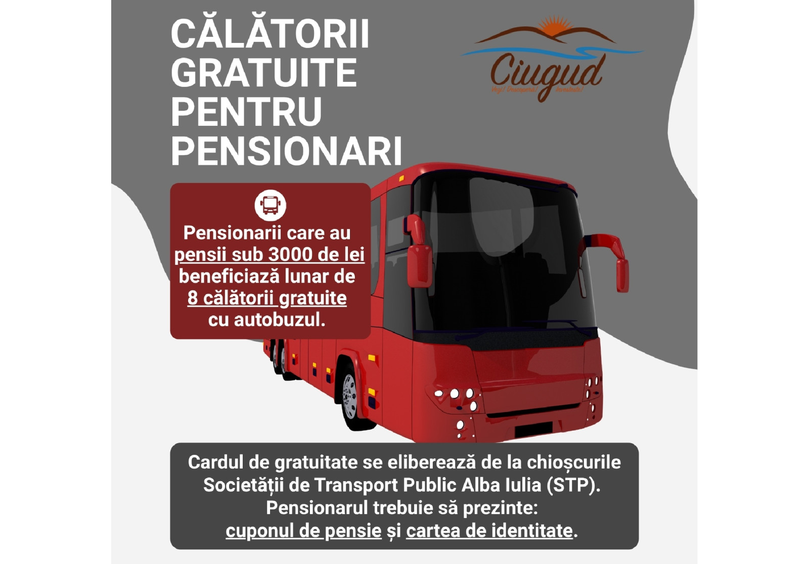 O parte dintre pensionarii din Ciugud vor beneficia lunar de 8 călătorii gratuite cu autobuzul. Precizările Primăriei