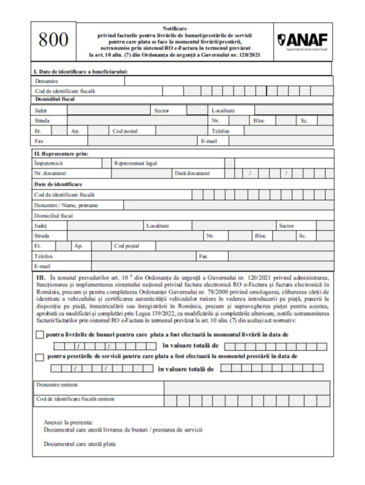 Pentru aceasta, va fi utilizat Formularul 800 – „Notificare privind facturile pentru livrările de bunuri/prestările de servicii pentru care plata se face la momentul livrării/prestării, netransmise prin sistemul RO e-Factura în termenul prevăzut”.