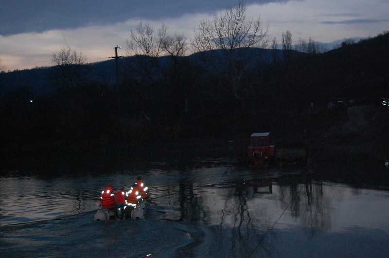 Pompierii militari au intervenit cu o barcă pneumatică şi o autospecială de descarcerare. La scurt timp după sosirea pompierilor, cele patru persoane au fost luate de pe podul plutitor şi transportate în siguranţă la mal, cu barca pneumatică. S-a încercat scoaterea podului plutitor (brudinei), pe care se afla tractorul şi remorca, cu un TAF şi un tractor, dar nu s-a reuşit, urmând a se relua operaţiunea."