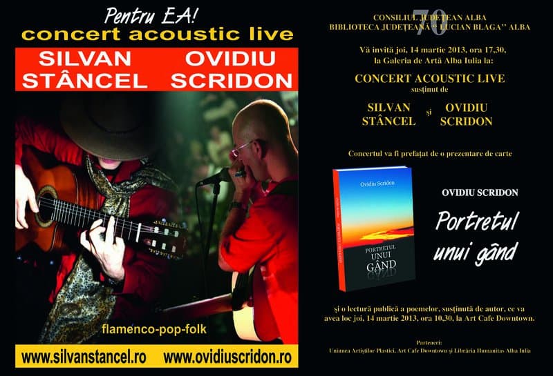 Cei care doresc să ia parte la un concert acustic live și să intre pentru câteva momente în lumea magică a poeziei o pot face joi, când Silvan Stâncel și Ovidiu Scridon vă vor încălzi sufletele cu spectacolul „Pentru Ea!”. Evenimentul va fi prefațat de o prezentare de carte: Ovidiu Scridon, „Portretul unui gând”.