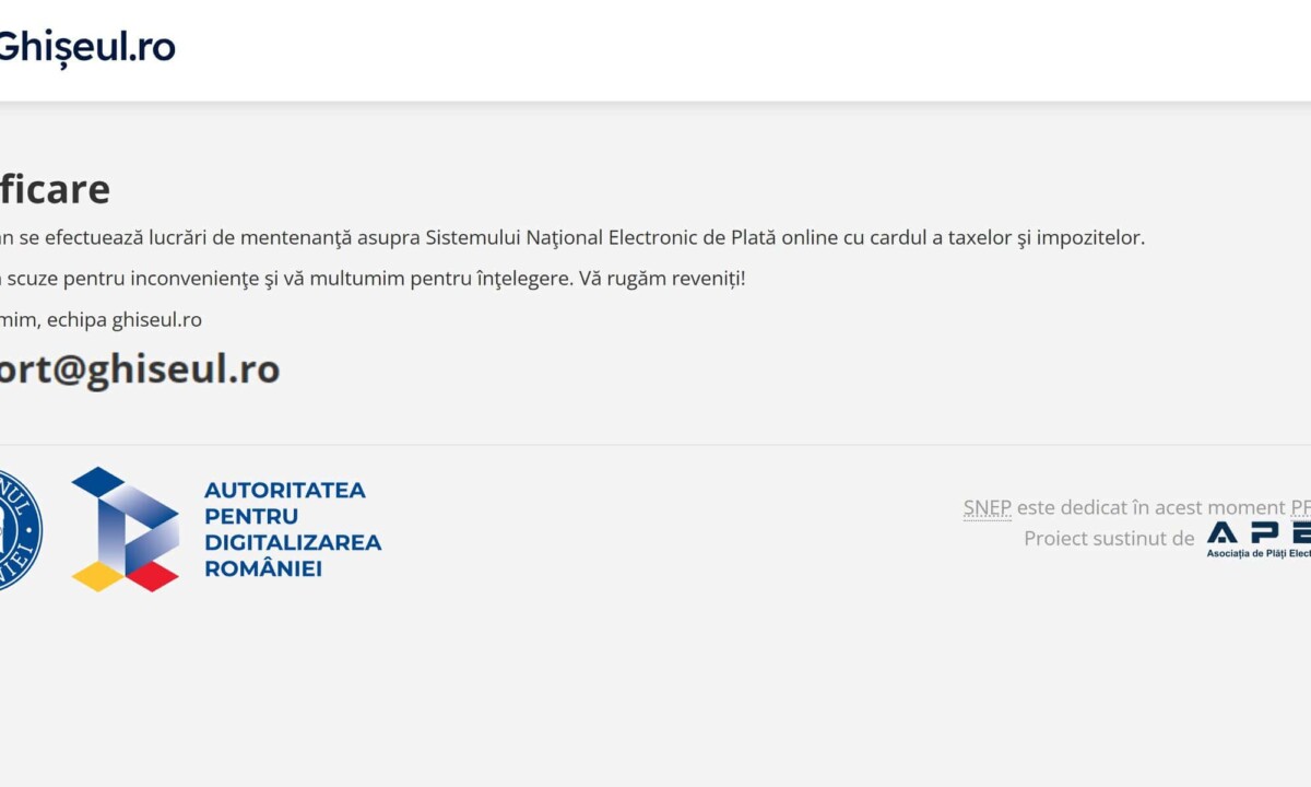 Platforma pentru plata taxelor Ghiseul.ro va redeveni funcțională în cursul zilei de vineri, 14 februarie, după patru zile în care nu a fost disponibilă din cauza unor probleme tehnice care au afectat și alte sisteme IT publice gestionate de Autoritatea pentru Digitalizarea României (ADR).
