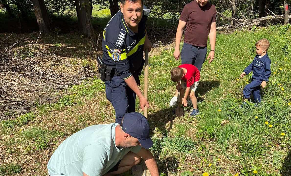 Polițiștii din Blaj au plantat puieți de frasin într-o pădure din oraș. Lecție de mediu pentru copiii lor, în aer liber