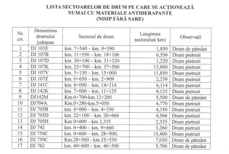 Având în vedere starea tehnică a drumurilor județene (îmbrăcăminți rutiere degradate, cu slabă etanșeitate) precum și necesitatea apărării acestora împotriva degradării pe timp de dezgheț, prevenirea și combaterea lunecușului se va face utilizand ca material antiderapant (nisip) și doar 10% max. 35% fondanți chimici (sare).