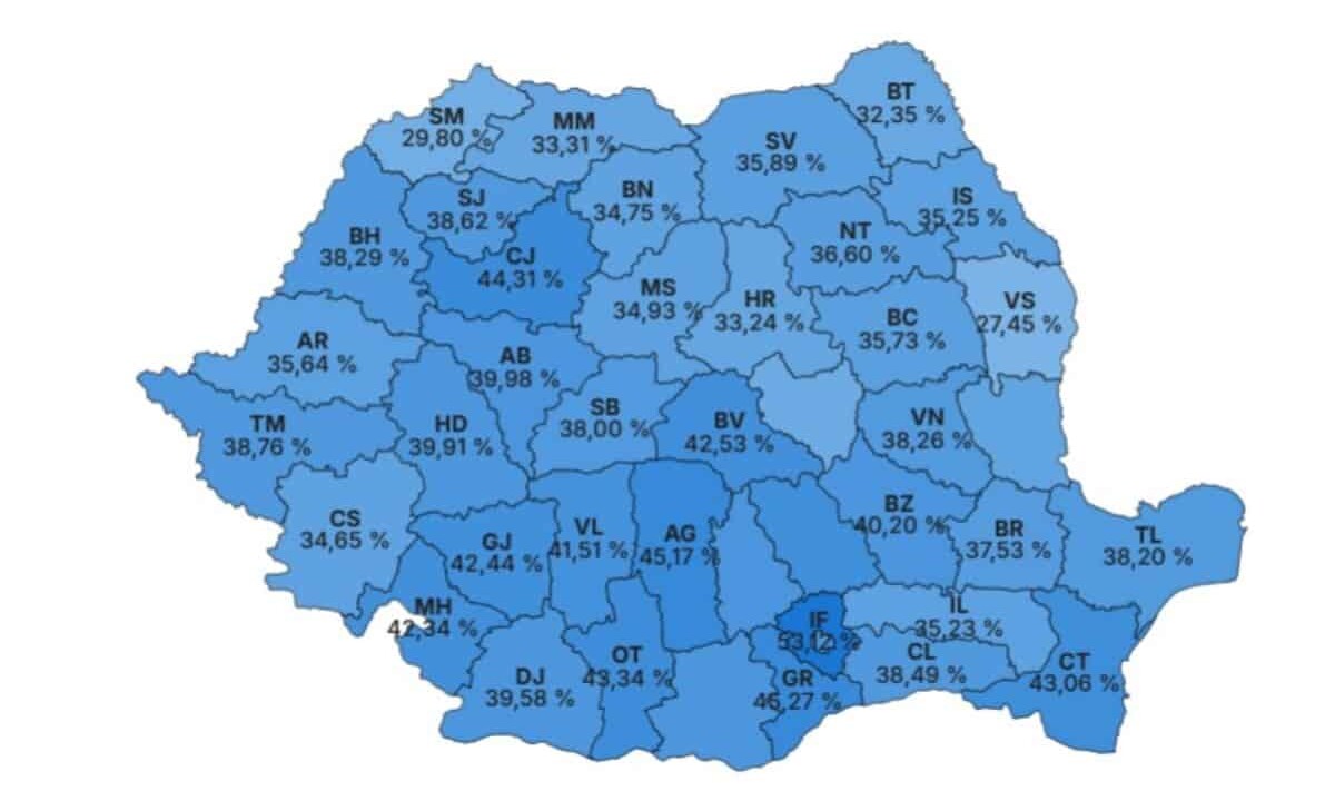 În Ilfov, prezența a depășit pragul de 50%. Alte județe cu prezență mare la vot sunt Giurgiu, Argeș, Cluj, Olt, Constanța, Brașov, Gorj, Prahova, Mehedinți.